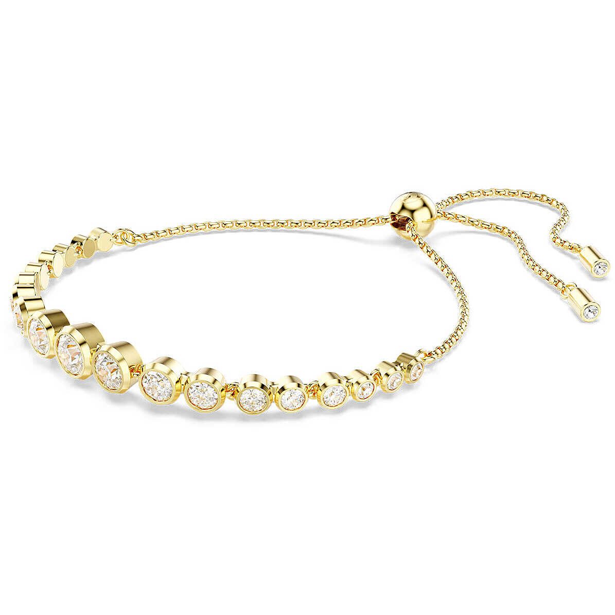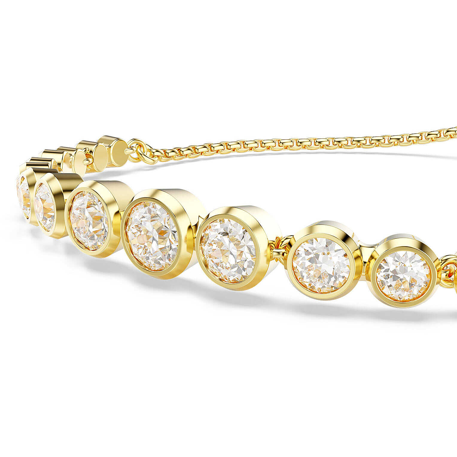 Bracciale tennis da donna di Swarovski della collezione Imber. Perfetto per un’eleganza da tutti i giorni, questo bracciale placcato in tonalità oro incarna la semplicità della famiglia Imber. Il design presenta una gradazione di cristalli Cry taglio Round, ognuno incastonato in una moderna montatura a castone su una delicata catena, con una chiusura scorrevole per indossarlo facilmente.