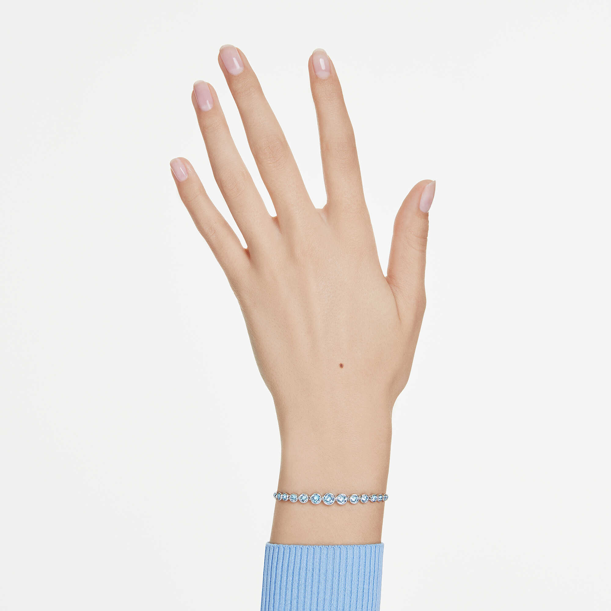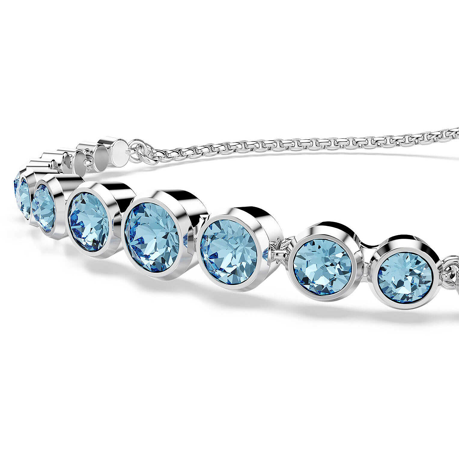 Bracciale tennis da donna di Swarovski della collezione Imber. Perfetto per un’eleganza da tutti i giorni, questo bracciale placcato rodio incarna la semplicità della famiglia Imber. Il design presenta una gradazione di cristalli blu taglio Round, ognuno incastonato in una moderna montatura a castone su una delicata catena, con una chiusura scorrevole per indossarlo facilmente.