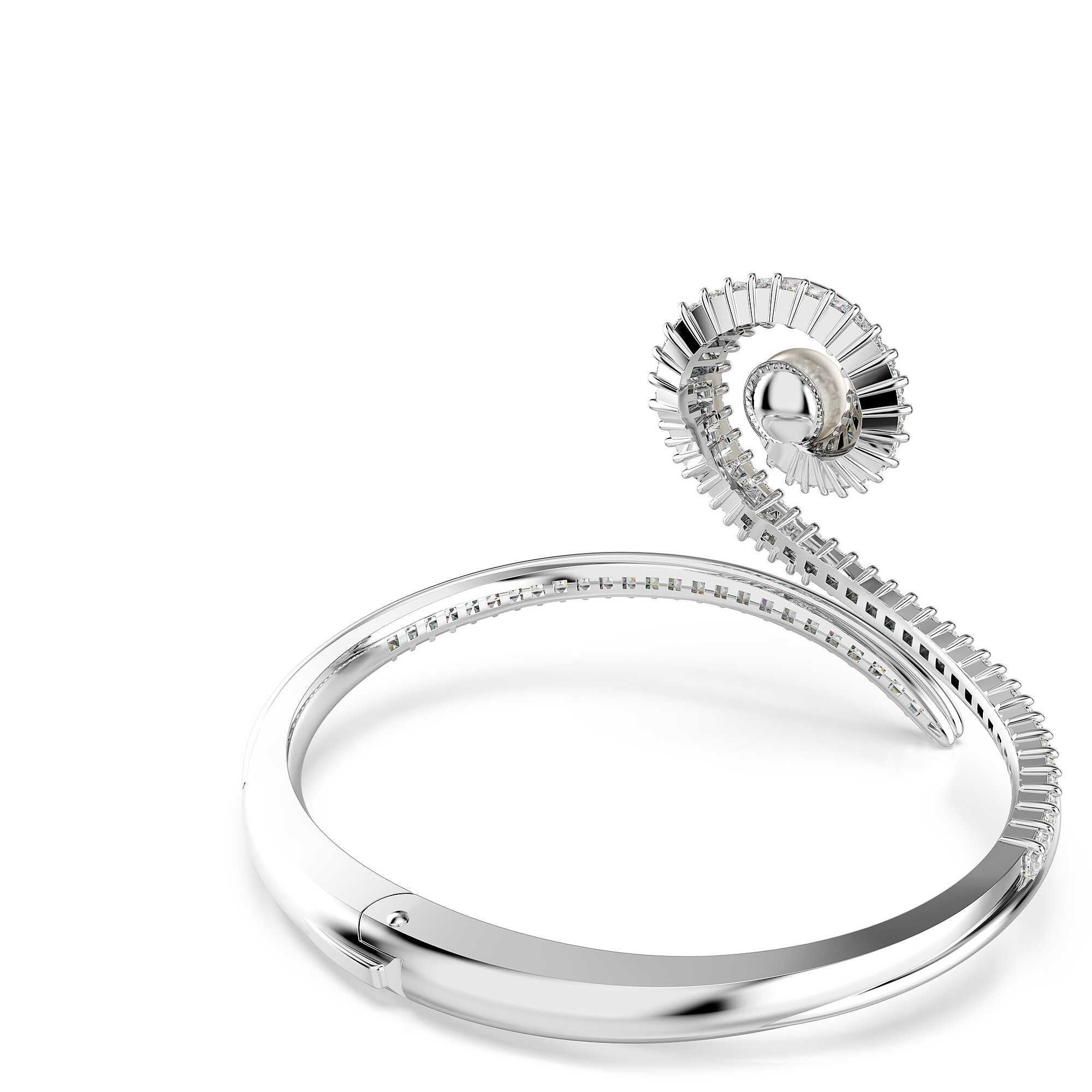 Bracciale Rigido da donna di Swarovski della collezione Ariana Grande x Swarovski. Questo bangle ispirato alla musica combina eleganza e creatività. Ispirato alla forma astratta di una chiave di violino, il design placcato rodio è splendidamente avvolto a spirale e impreziosito da Swarovski Zirconia taglio Baguette. Per un ulteriore tocco di lusso, una singola Crystal Pearl Swarovski è posizionata al centro. Il modo perfetto per donare al tuo stile un’infusione allegra e ritmica. Lunghezza: 17 cm Diametri interni: 6.2 x 5.2 cm Dimensione decorazione: 4 x 6.9 cm Distanza apertura: 3.5 cm. La referenza è 5720864