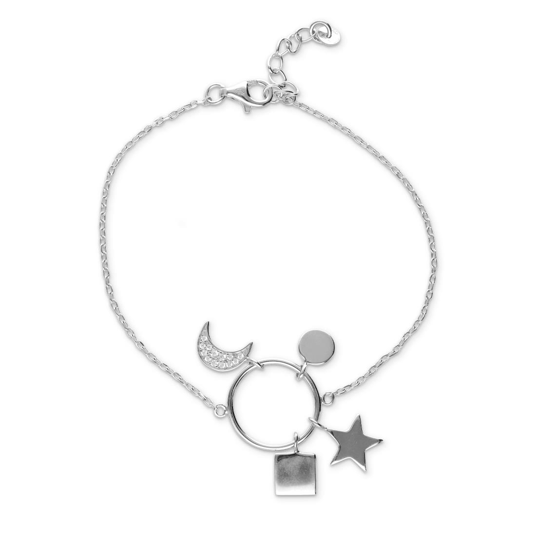Bracciale Oro&Co 925 in argento rodiato simboli stella luna cerchio quadrato con zirconi bianchi. Lunghezza 19 cm