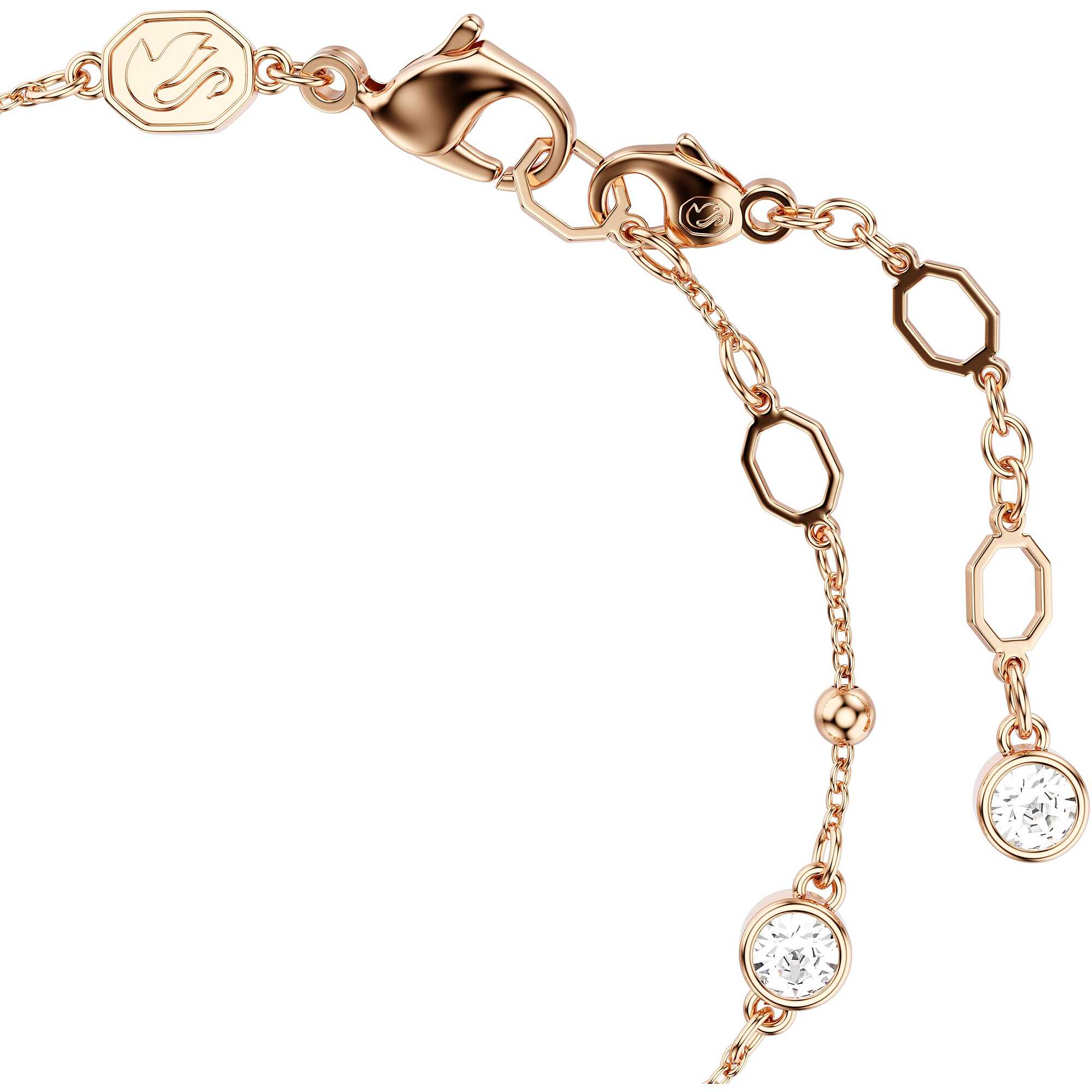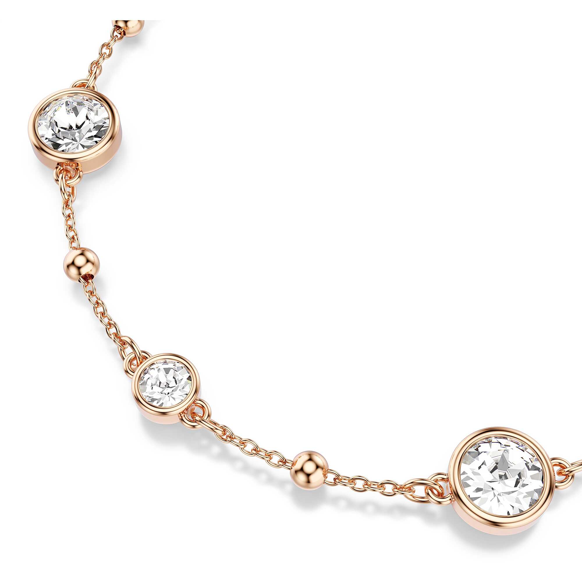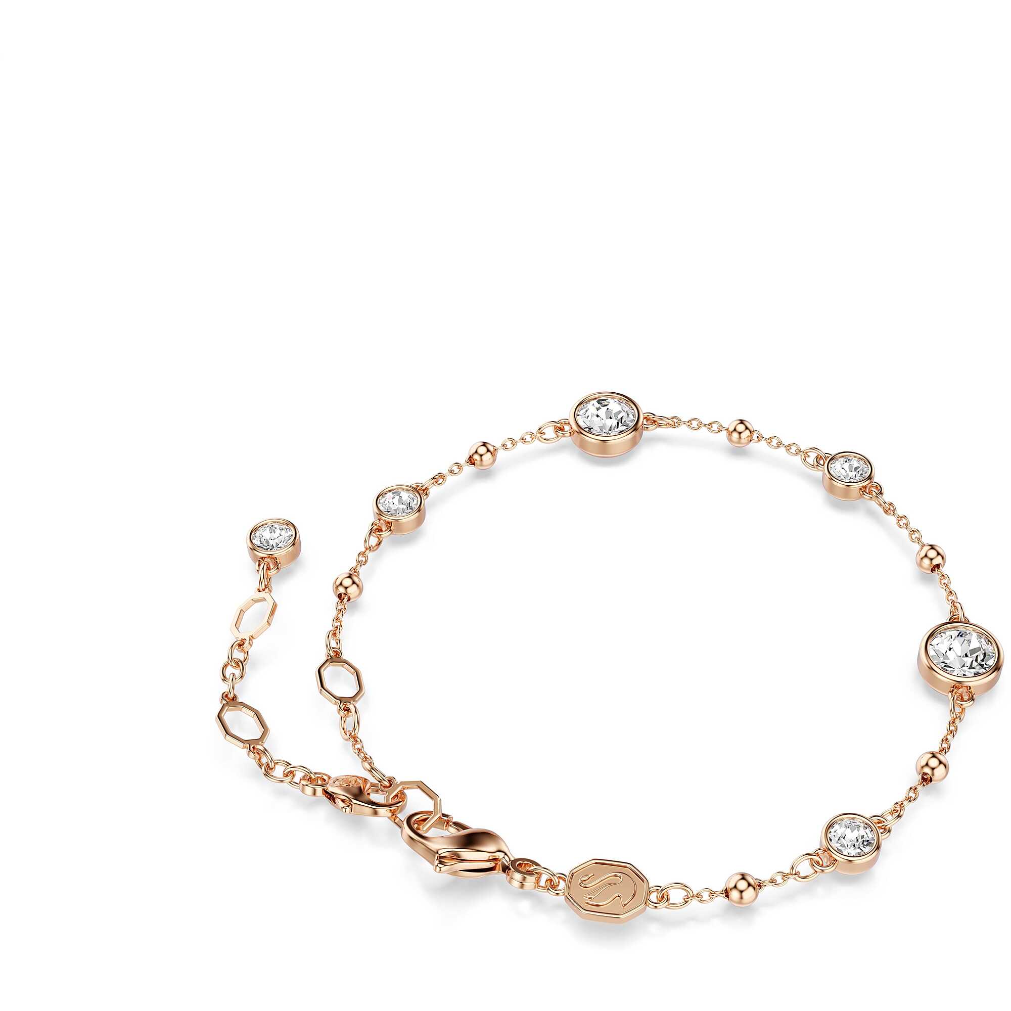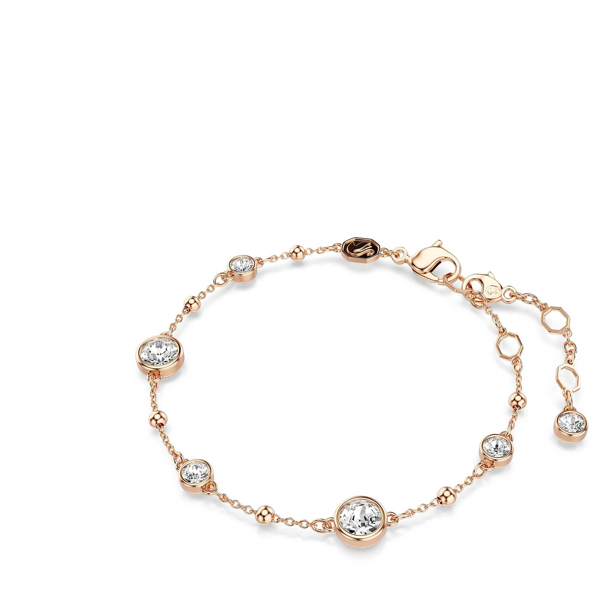 Bracciale Swarovski collezione Imber placcato oro rosa con cristalli bianchi taglio rotondo. Impreziosito da elementi metallici e cristalli in montatura a castone, con chiusura a moschettone ed extender regolabile. Misura: lunghezza 16.5 - 20.5 cm, decorazione 0.6 x 0.6 cm.