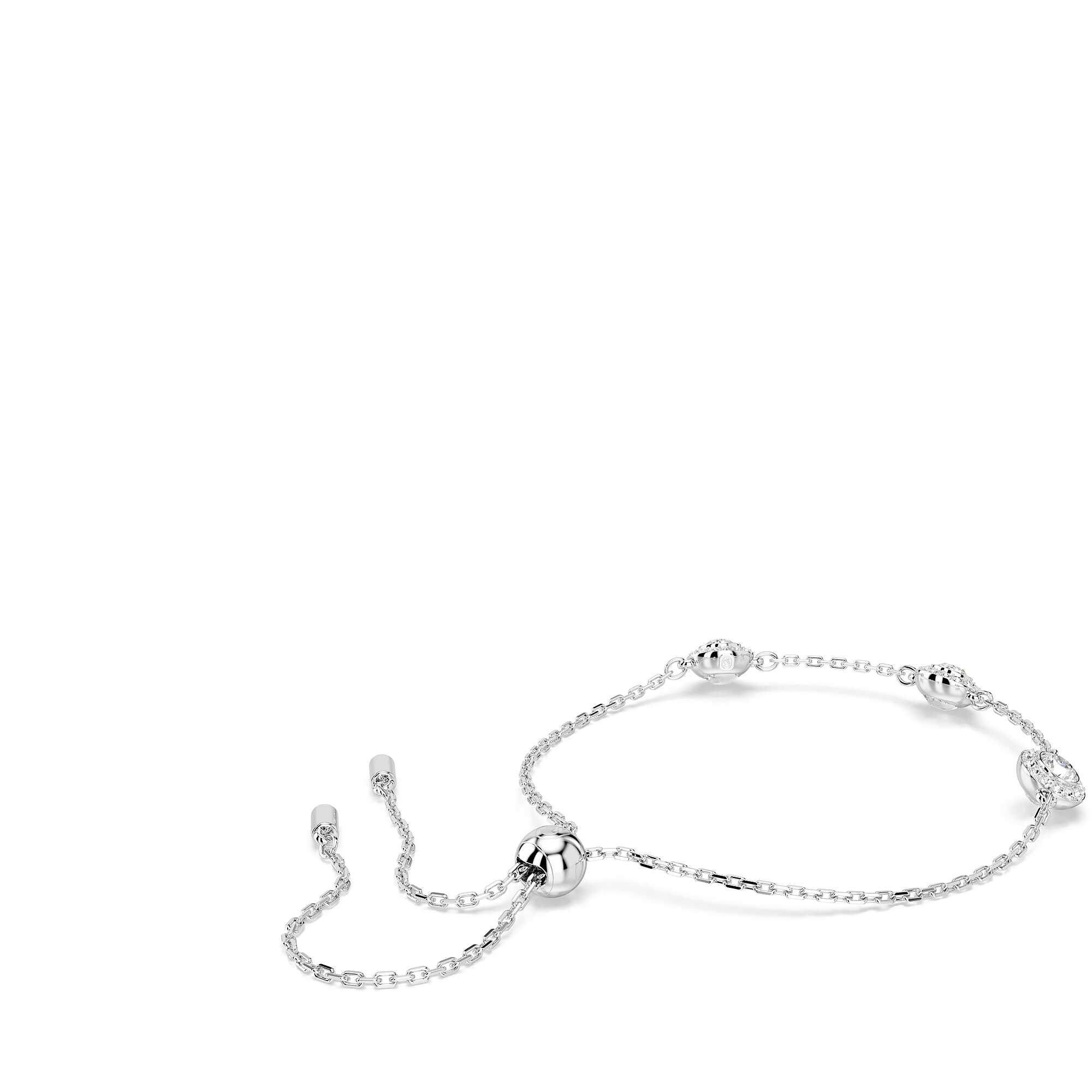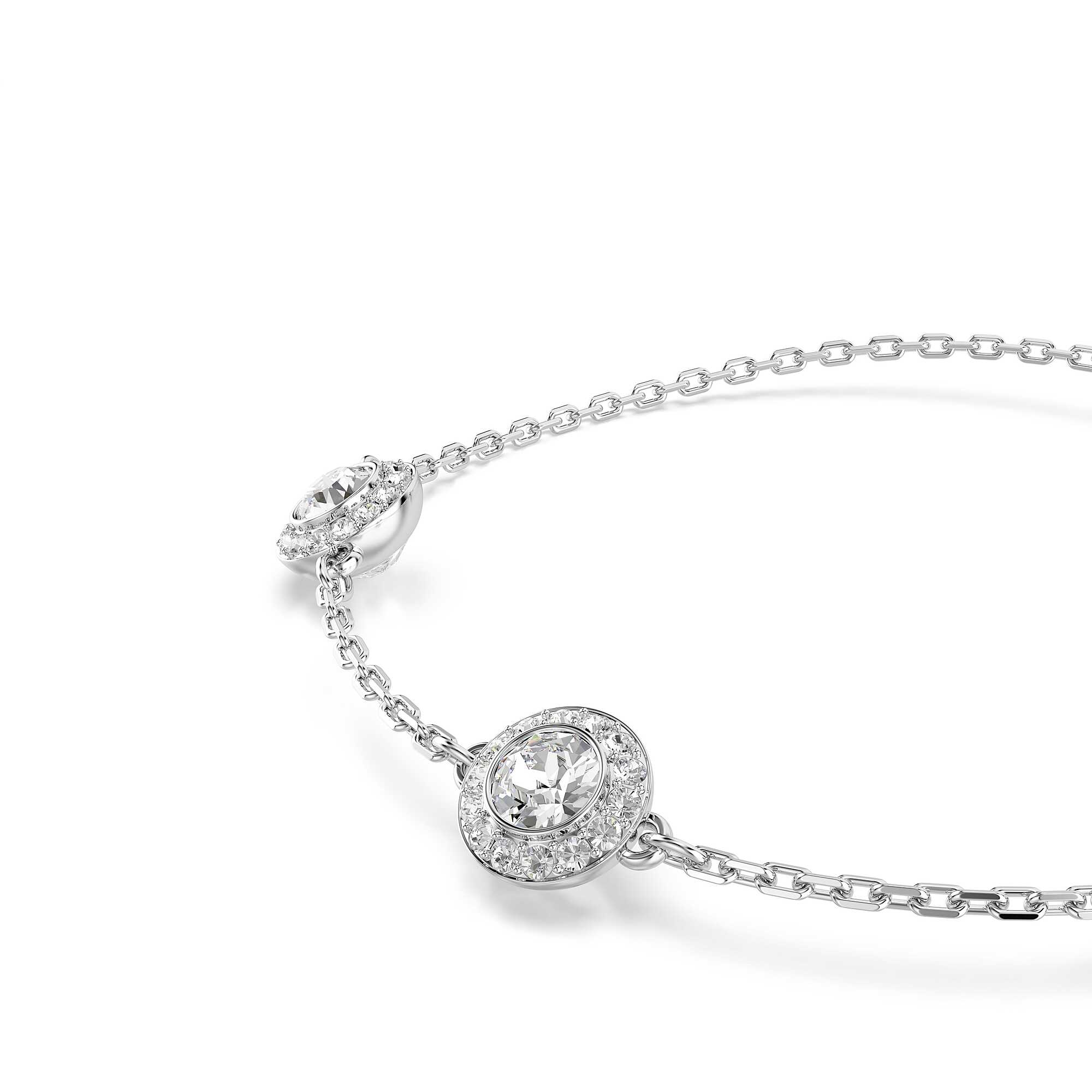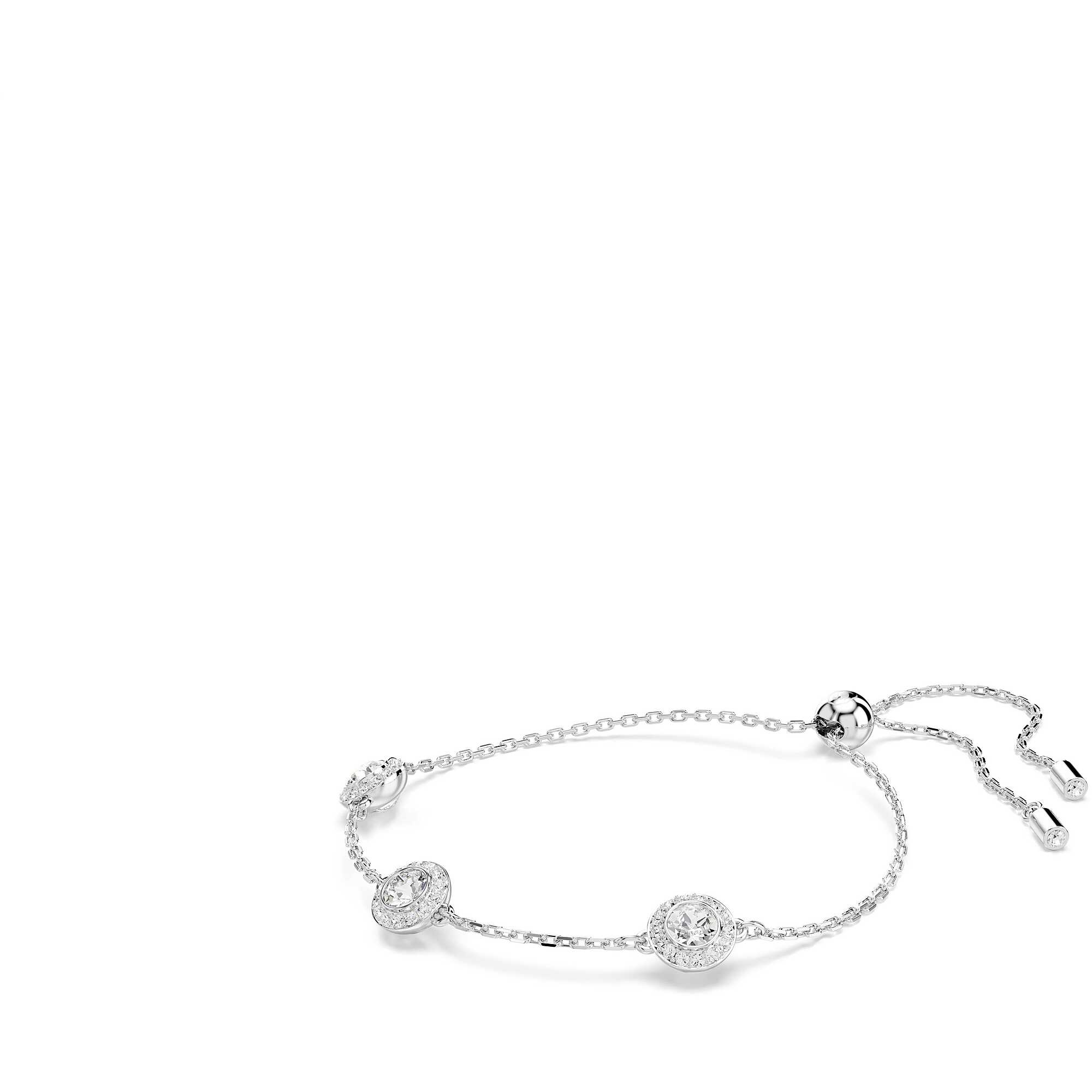 Bracciale Swarovski collezione Una Angelic placcato in rodio con tre motivi double face impreziositi da cristalli taglio round. Lunghezza massima: 24 cm. Dimensione decorazione: 0.8 x 1 cm.