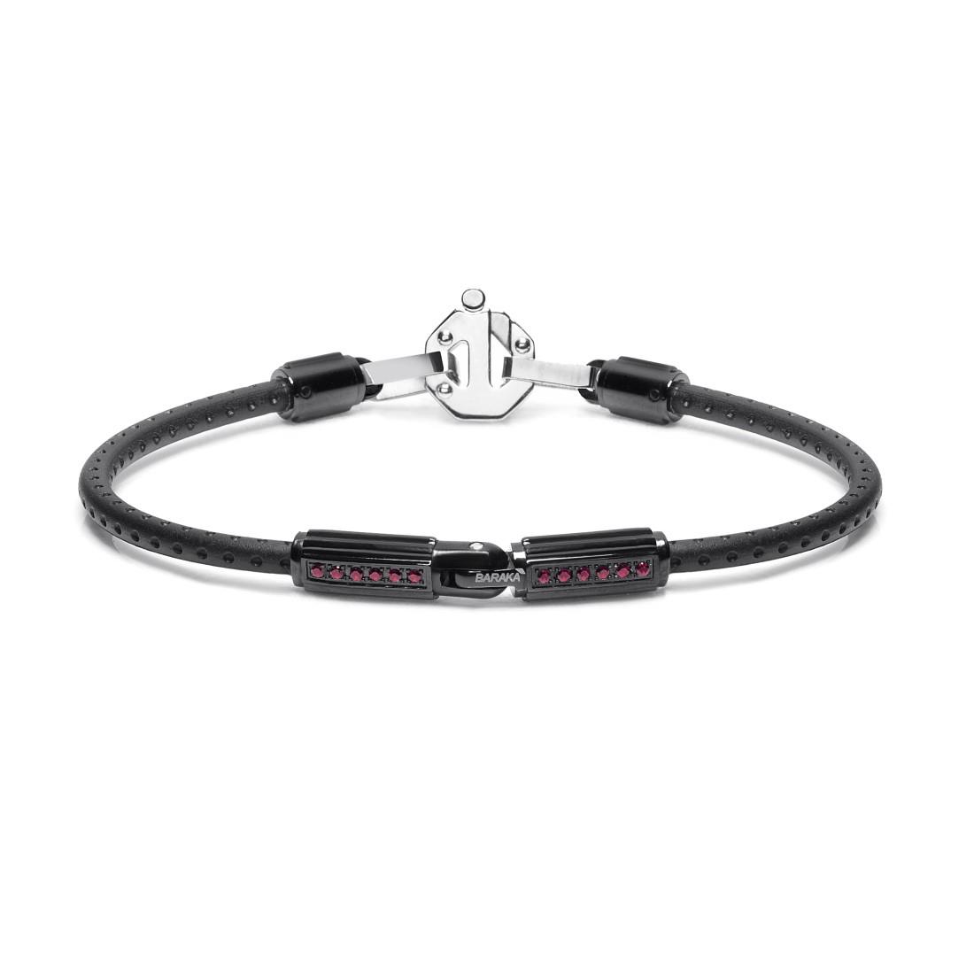 Bracciale da uomo Barakà in caucciu e acciaio nero con topazi rossi ct. 0,34 e diamante ct. 0,02. Misura 18 cm