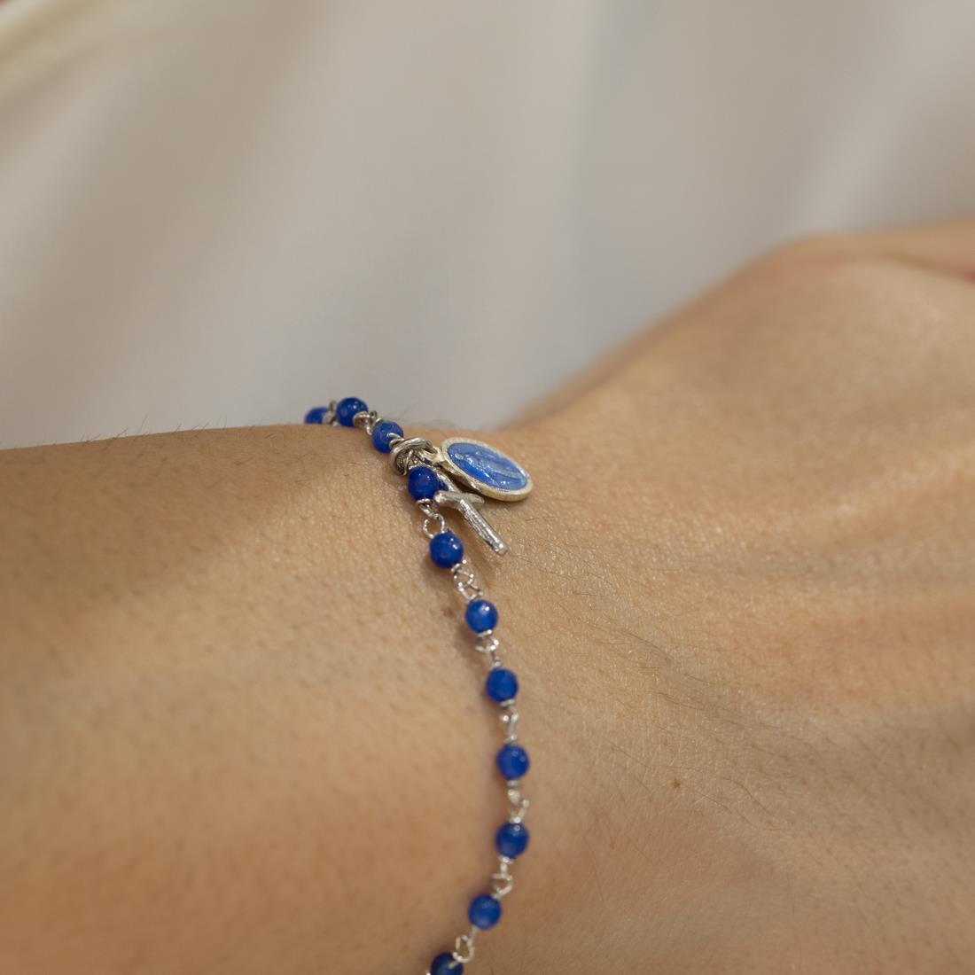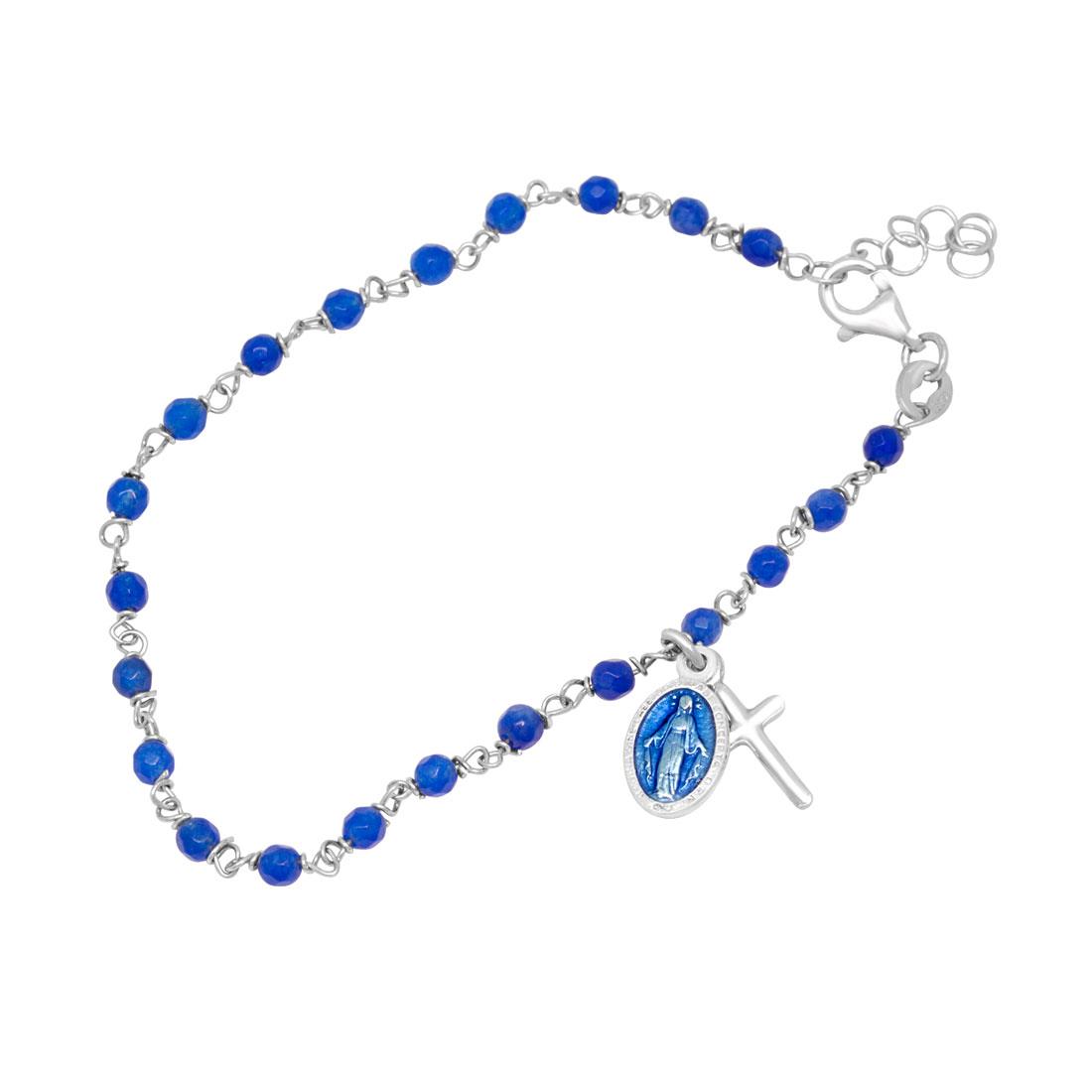 Bracciale design ORO&CO in argento , stile rosario , pendente a croce e pietre blu, lunghezza 16-20 cm