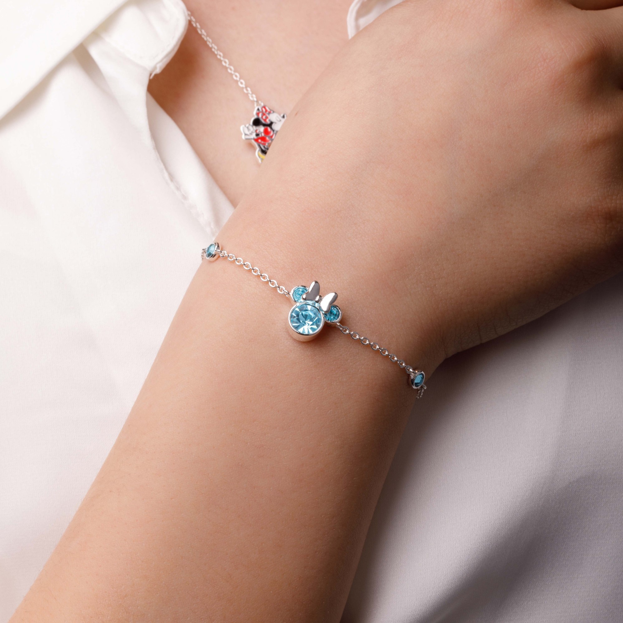 Bracciale da bambina della collezione Minnie Mouse di Disney. Gioiello in argento 925 e cristallo di colore blu chiao. Misura: 14+3 CM