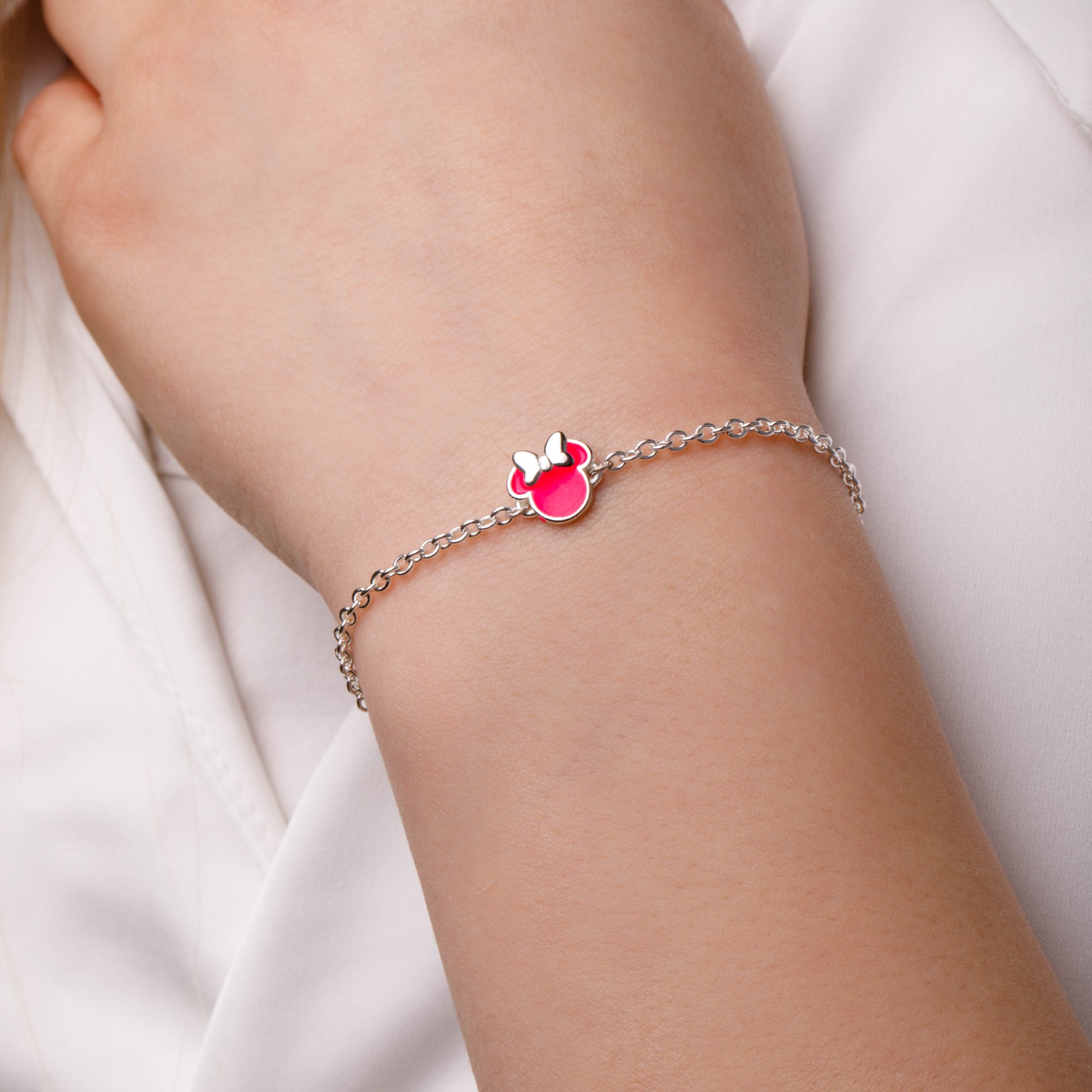 Bracciale da bambina della collezione Minnie Mouse di Disney. Gioiello in argento 925 e smalto di colore rosa fluo.