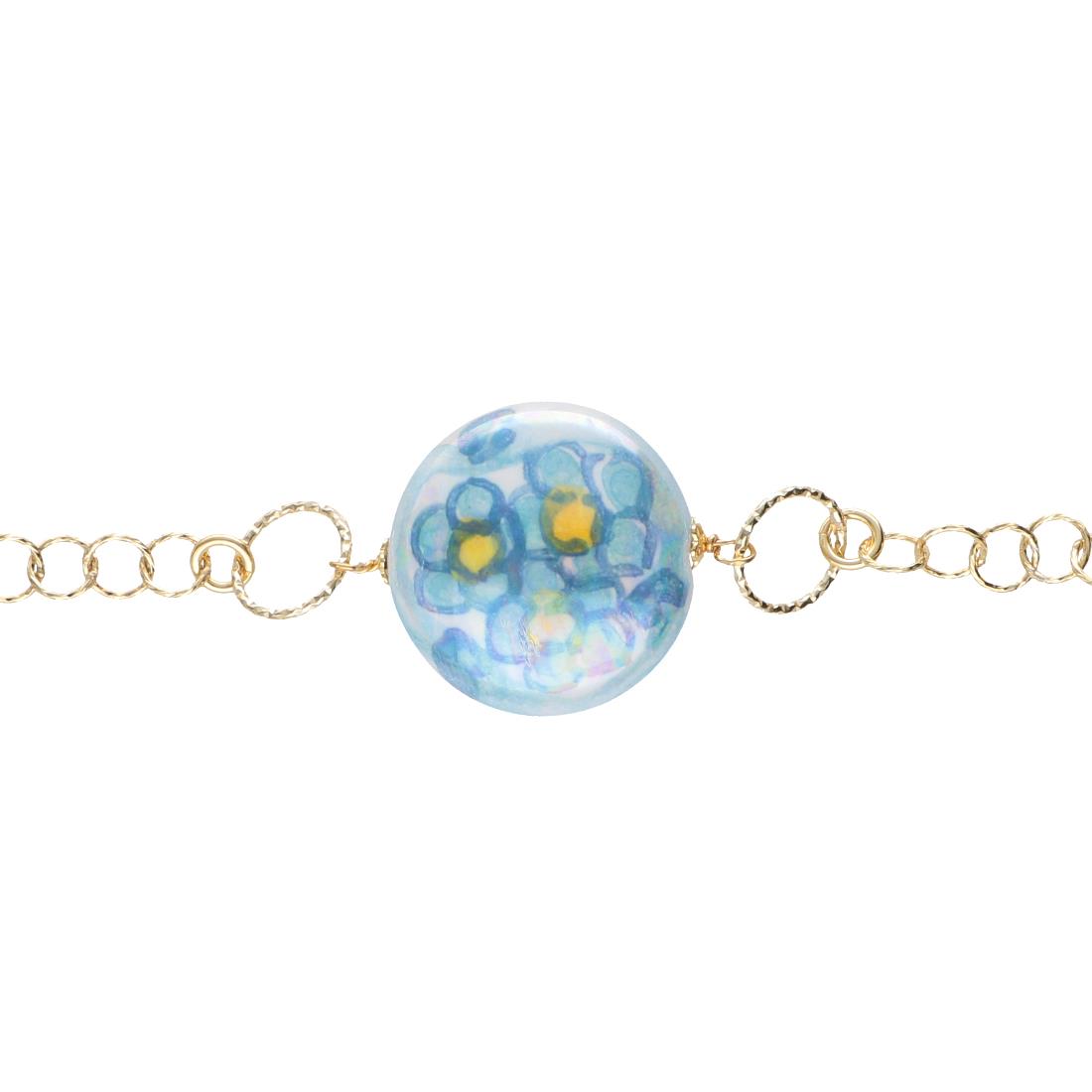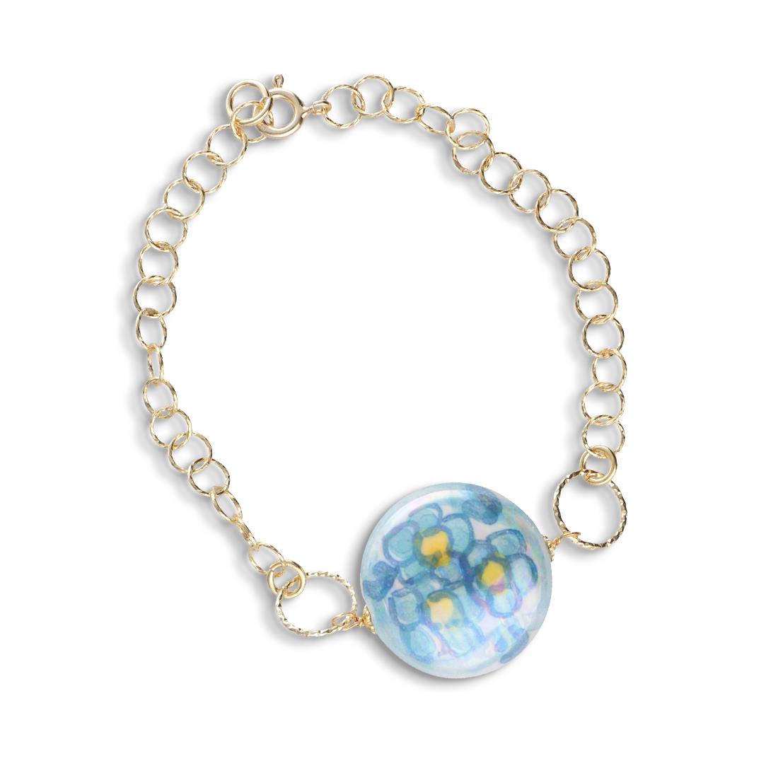 Bracciale de Le Perle di Caltagirone in argento dorato con ceramica dipinta a mano celeste con fiore Non ti scordar di me. Lunghezza 20 cm. Diametro perle 22 mm.