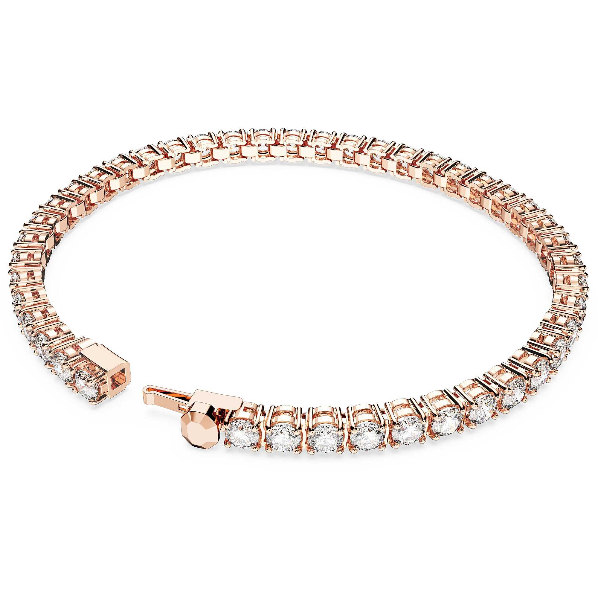Braccialetto Swarovski Matrix Tennis, Taglio tondo, Bianco, Placcato color oro rosa. La misura è M. Lunghezza minima: 16.5 cm Lunghezza massima: 16.5 cm Larghezza: 0.4 cm Caldo e scintillante al tempo stesso, questo splendido bracciale è realizzato con un cerchio completo di pietre trasparenti su una montatura con placcatura in tonalità oro rosa. Ciascuno dei cristalli riflette la luce in modo meraviglioso per assicurare che il tuo polso sia sempre al centro dell'attenzione, ovunque vai. Ac