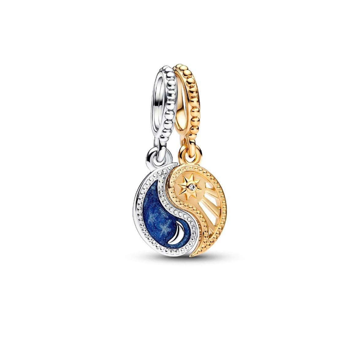 Charm pendente Pandora Sole e Luna Divisibile (Yin e Yang). Yang in argento placcato oro con sole in rilievo e raggi intagliati con scritta "Shine bright", Yin in argento con luna crescente decorata da smalto blu con scritta "Dream big".