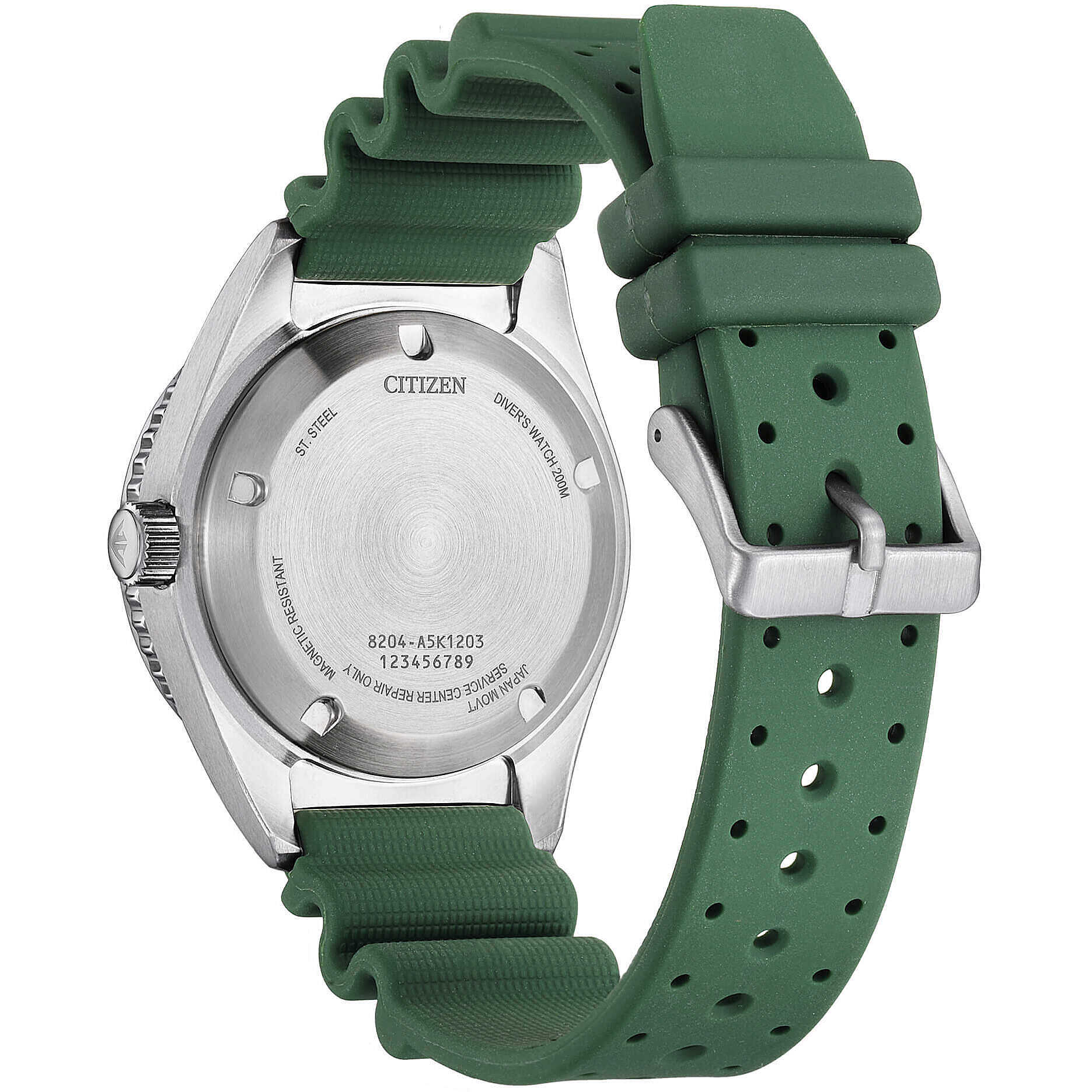 Orologio da uomo di Citizen della collezione Promaster. Orologio solo tempo diver con movimento meccainico a ricarica automatica citizen e resistenza all'acqua di 20 ATM. La cassa é in acciaio con fondo e corona serrati a vite ghiera girevole unidirezionale, il diametro é di 41mm. Il quadrante é verde con indici applicati con giorno e data . Vetro minerale. Il cinturino é in morbido caucciu' nero. La referenza è: NY0121-09X.