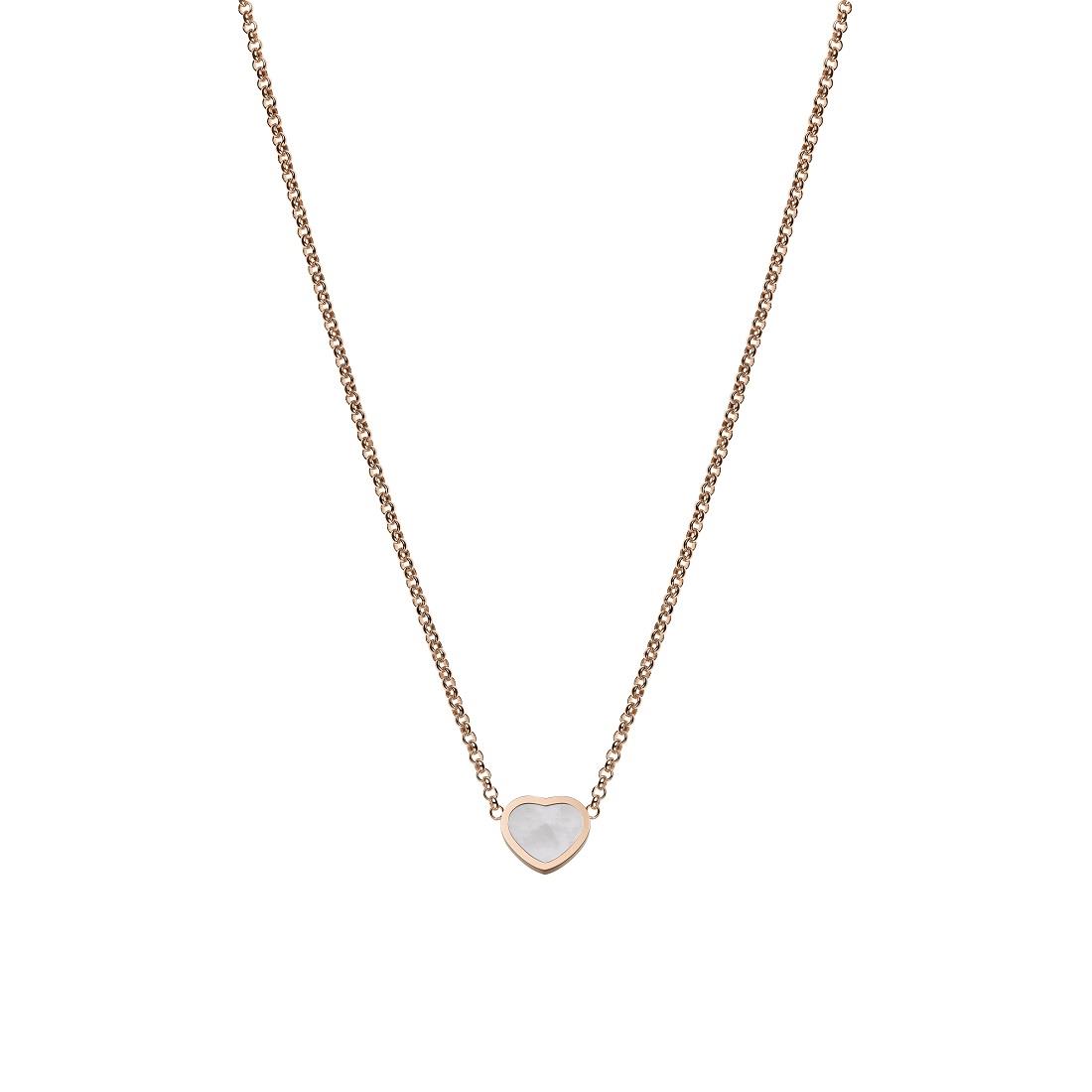 Collana Chopard collezione Happy Hearts in oro rosa con cuore in madreperla bianca. lunghezza regolabile da 37 a 41 cm.