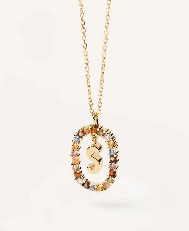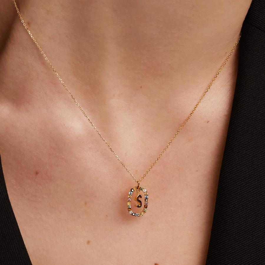 Collana PDPAOLA in argento placcato oro 18kt collezione Letters, con ciondolo lettera S, impreziosito da labradorite, occhio di tigre, madreperla, cristallo oro giallo, cristallo verde peridoto, cristallo verde oliva, cristallo spinello azzurro, cristallo violetto rodolite e cristallo bianco puro. Chiusura regolabile da 40 cm a 55 cm.