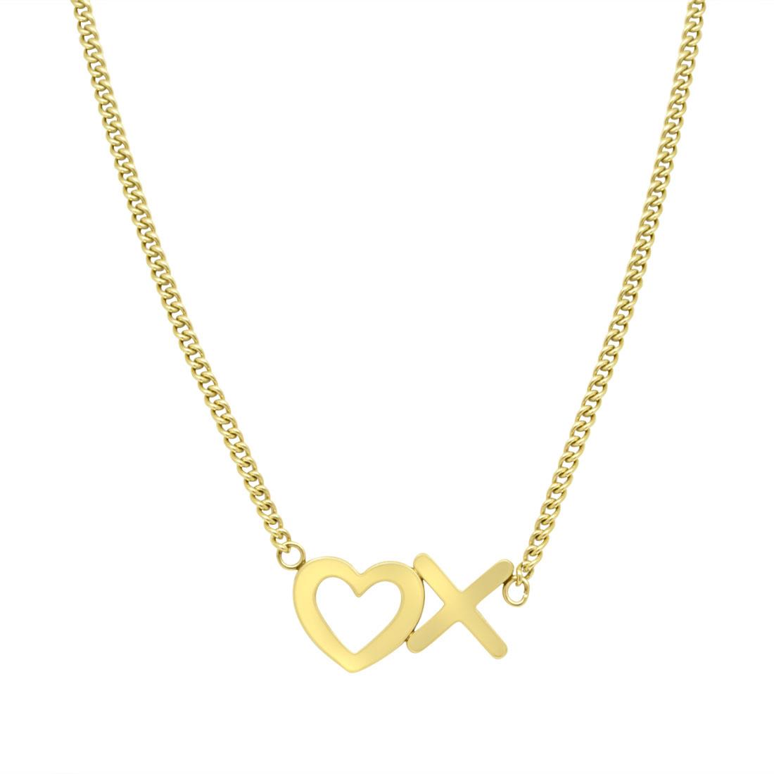 Collana a maglia in acciaio colore oro giallo con centrale a cuore e X, lunghezza 42cm