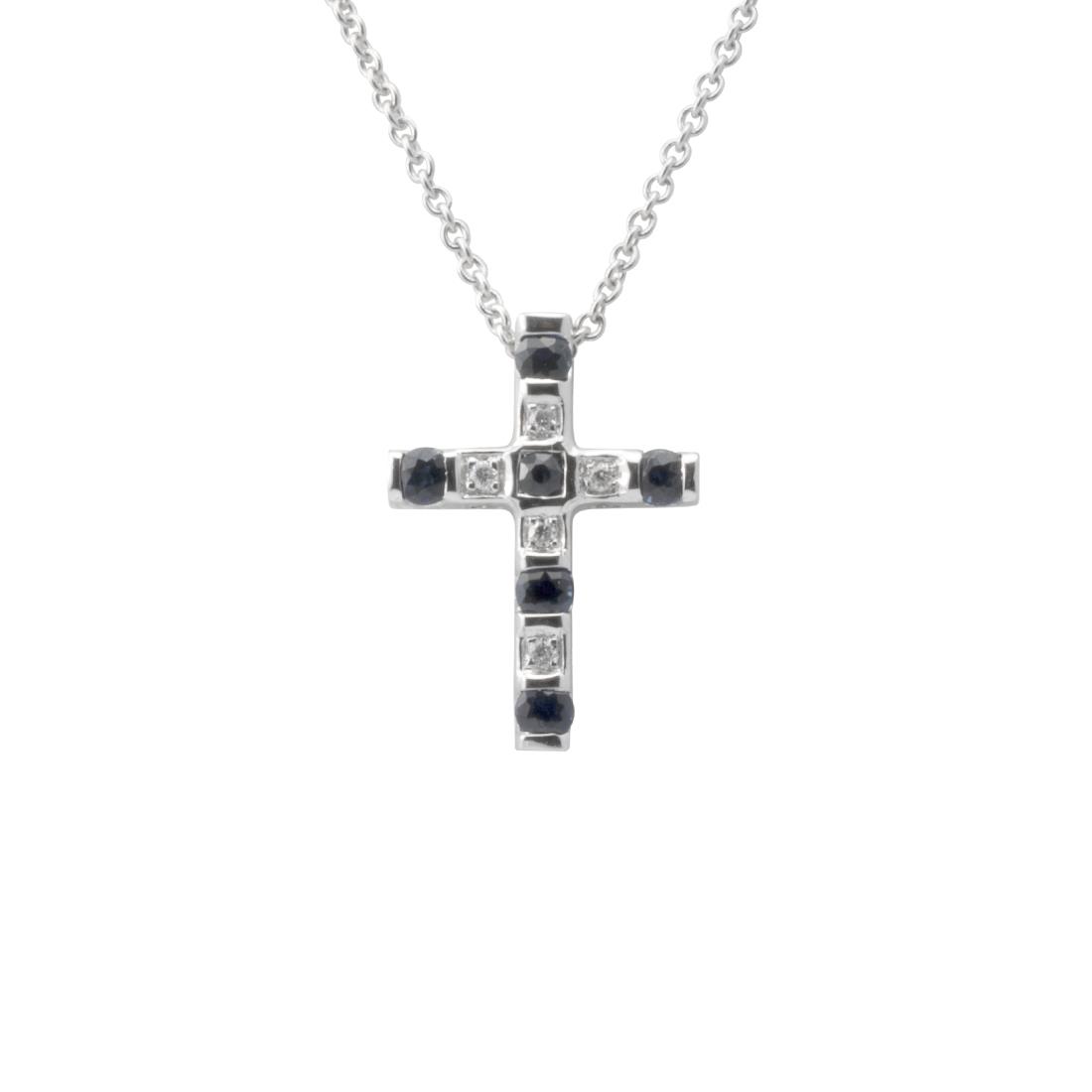 Collana croce in oro bianco con diamanti ct 0.015 e zaffiri ct 0.30