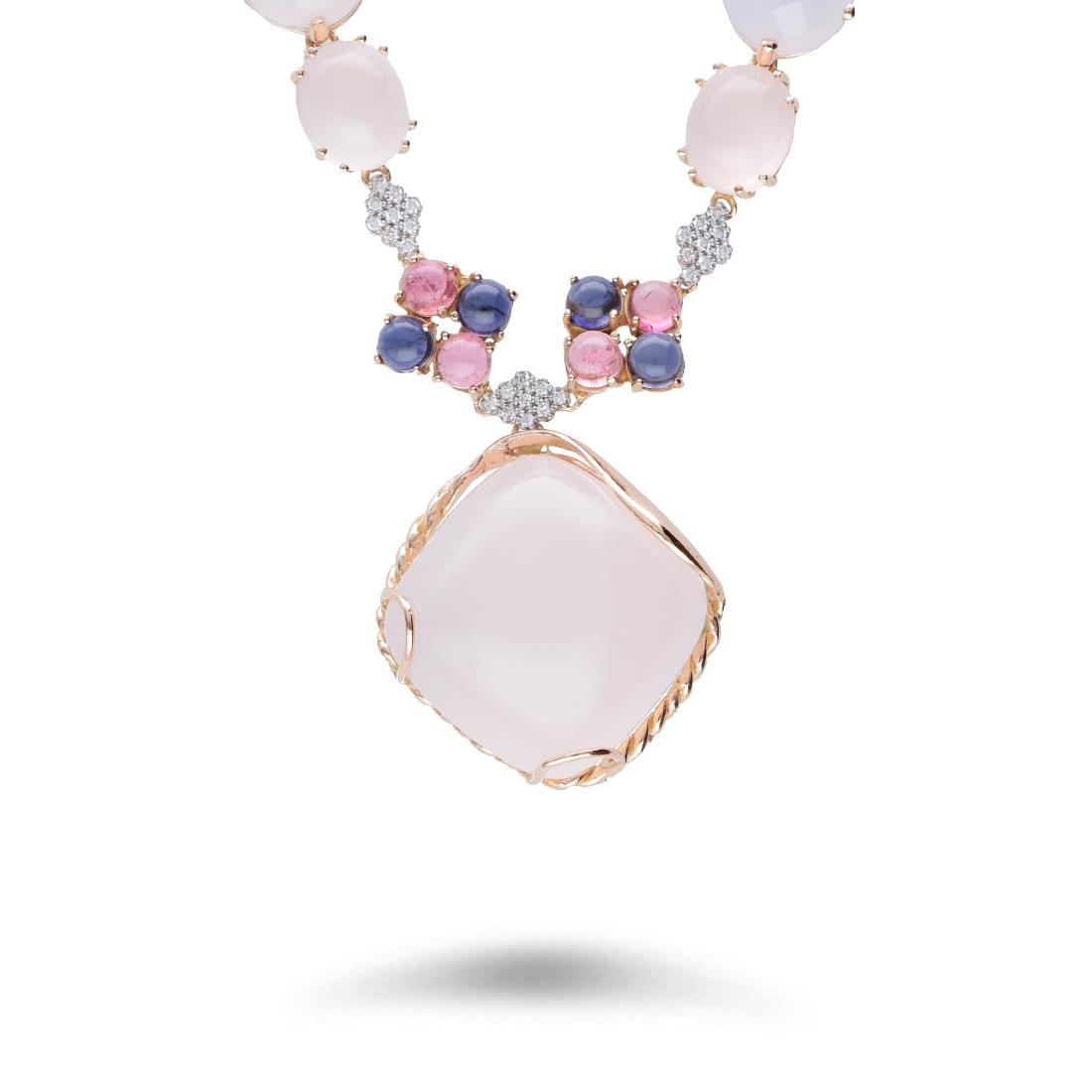Collana Stanoppi in oro rosa 18kt con pietre naturali quarzo rosa, calcedonio, tormaline rosa, iolite e diamanti cts 0,63. Lunghezza 45 cm.
