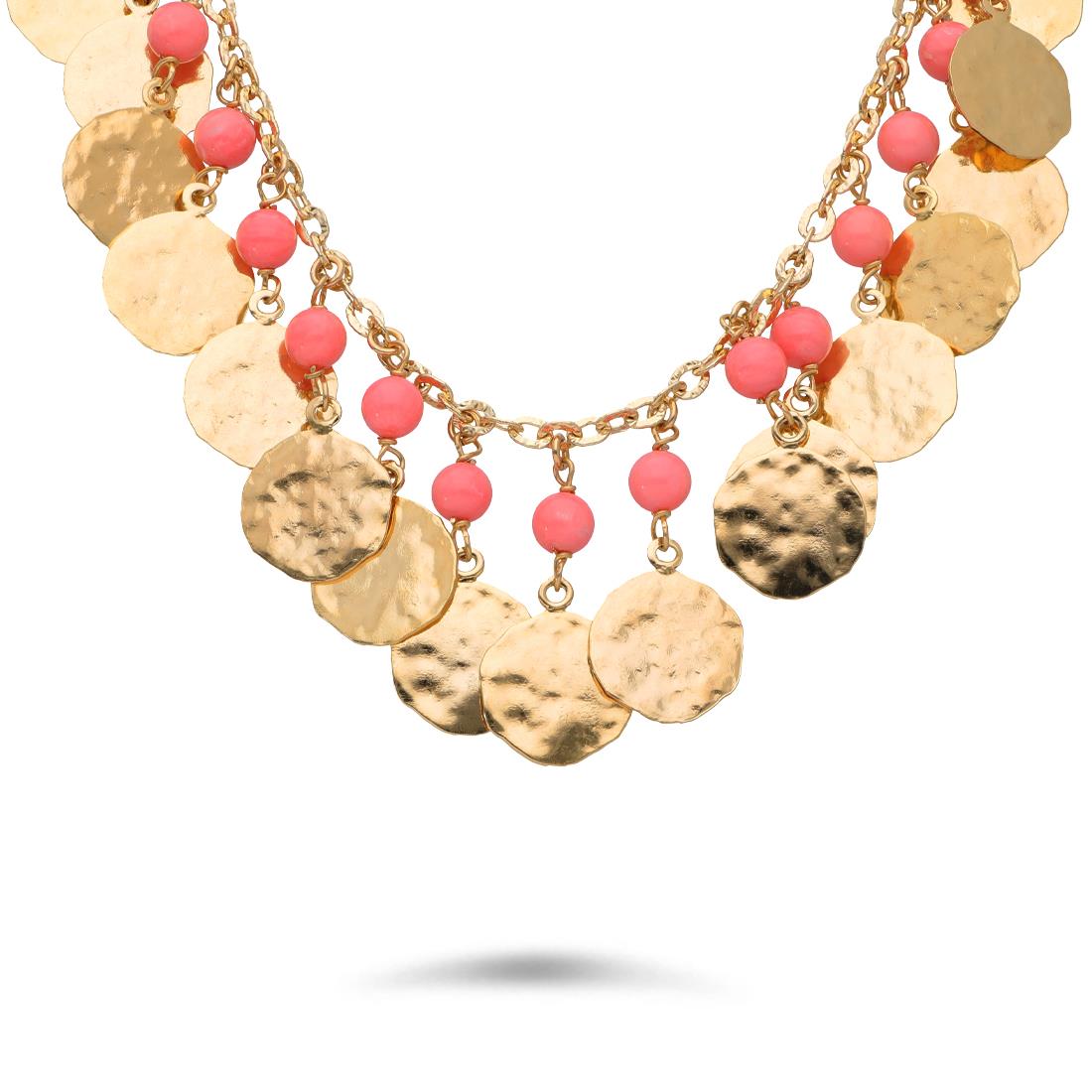 Collana Toscana by Etrusca placcato oro 18 Kt con perline rosa e cerchi con effetto martellato. Lunghezza 100 cm.