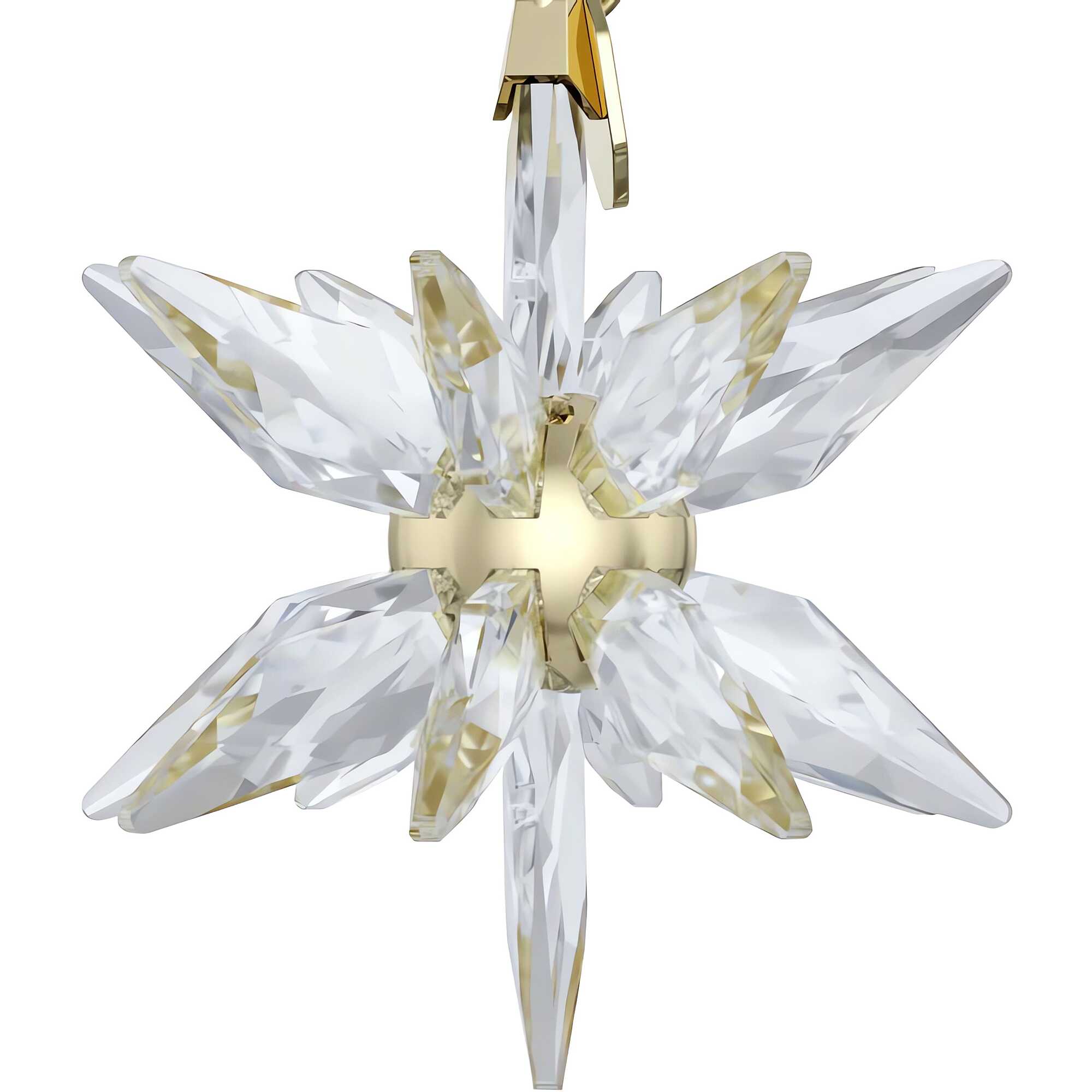 Decorazione Stella Swarovski collezione Annual Edition con cristalli di colore bianco e centro in metallo con finitura oro champagne. Realizzata con 393 sfaccettature e nastro in gros-grain bianco inciso 2025. Misura: 6.1 x 4.6 x 4.6 cm.