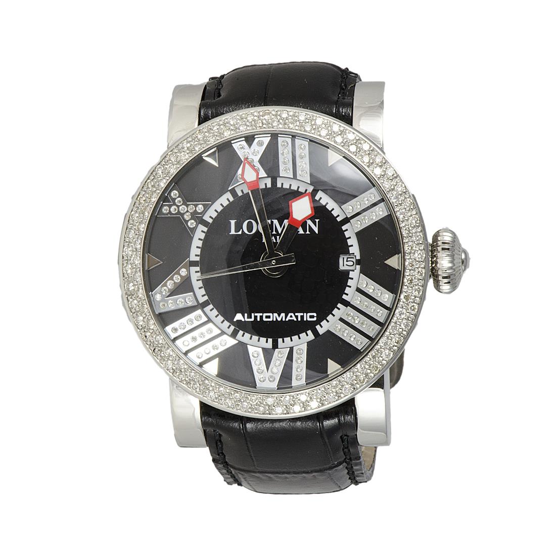 Orologio Locman, movimento automatico cassa in acciaio rotonda con diamanti e cinturino in pelle nera, vetro zaffiro