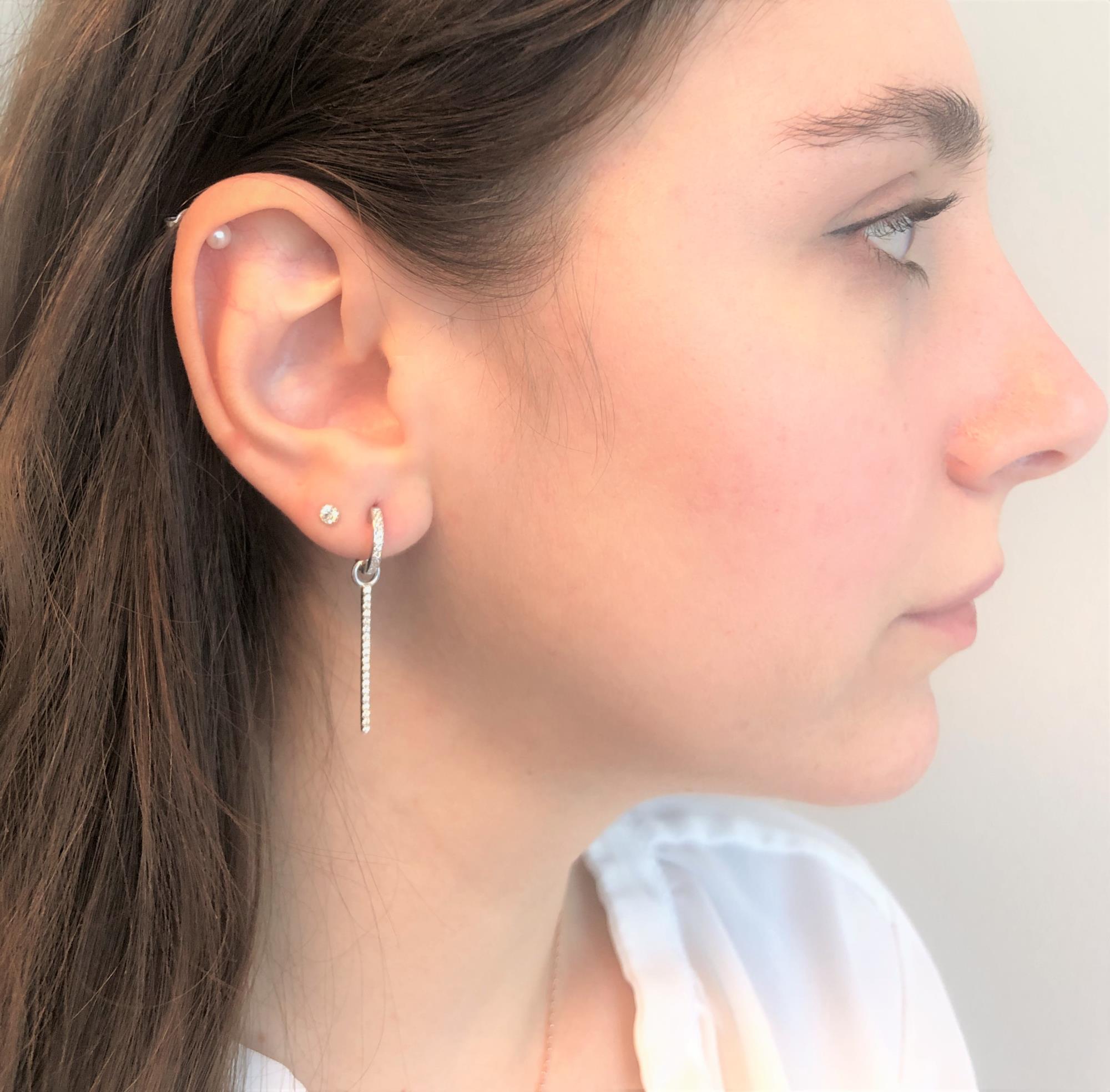 Orecchini Cuori Milano in argento. 1 orecchino a cerchio con pendente lettera "I" con zirconi bianchi e 1 orecchino a lobo zircone a forma di cuore. Altezza lettera 2,5 cm.