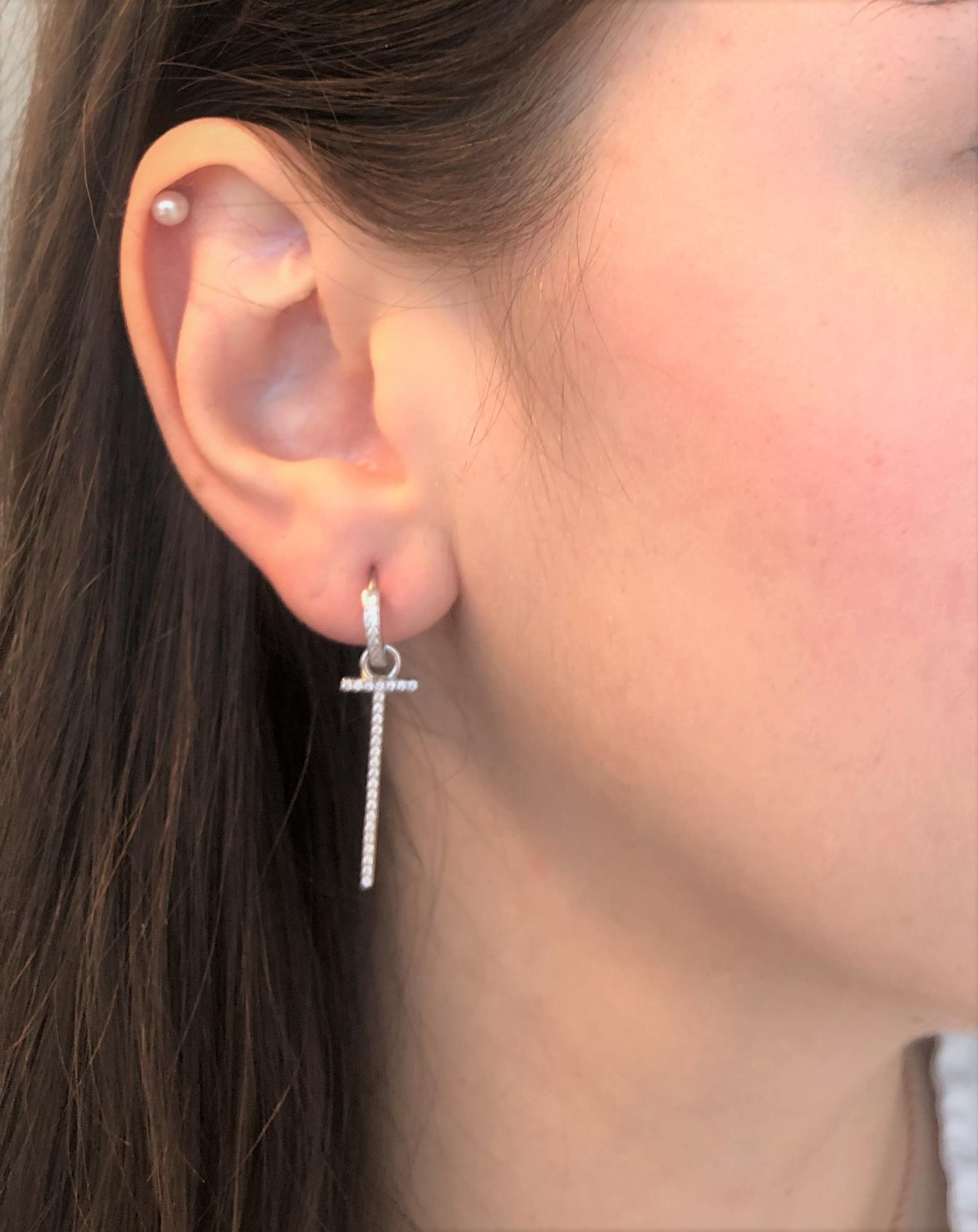 Orecchini pendenti lettera T in argento con zirconi bianchi