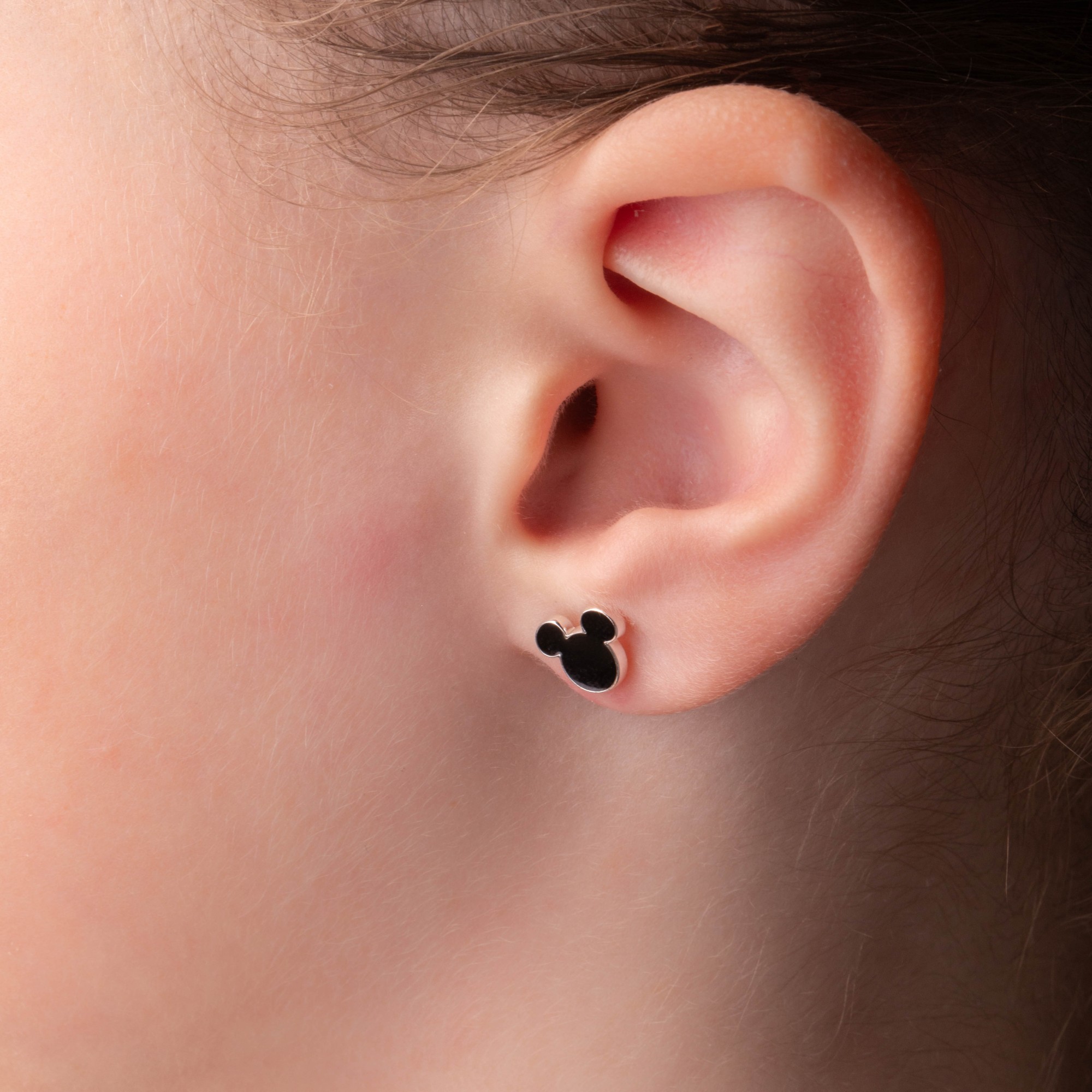 Orecchini da bambina della collezione Mickey Mouse di Disney. Orecchini in argento 925 e smalto di colore nero. Orecchini con chiusura a bottone. Gioiello con simbolo Mickey Mouse.
