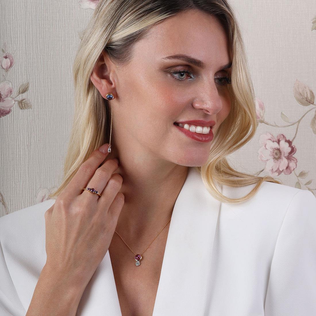 Orecchini pendenti Alfieri & St John collezione Gemma in oro giallo con topazi blu london taglio cabochon 7mm e pave' diamanti ct 0,10