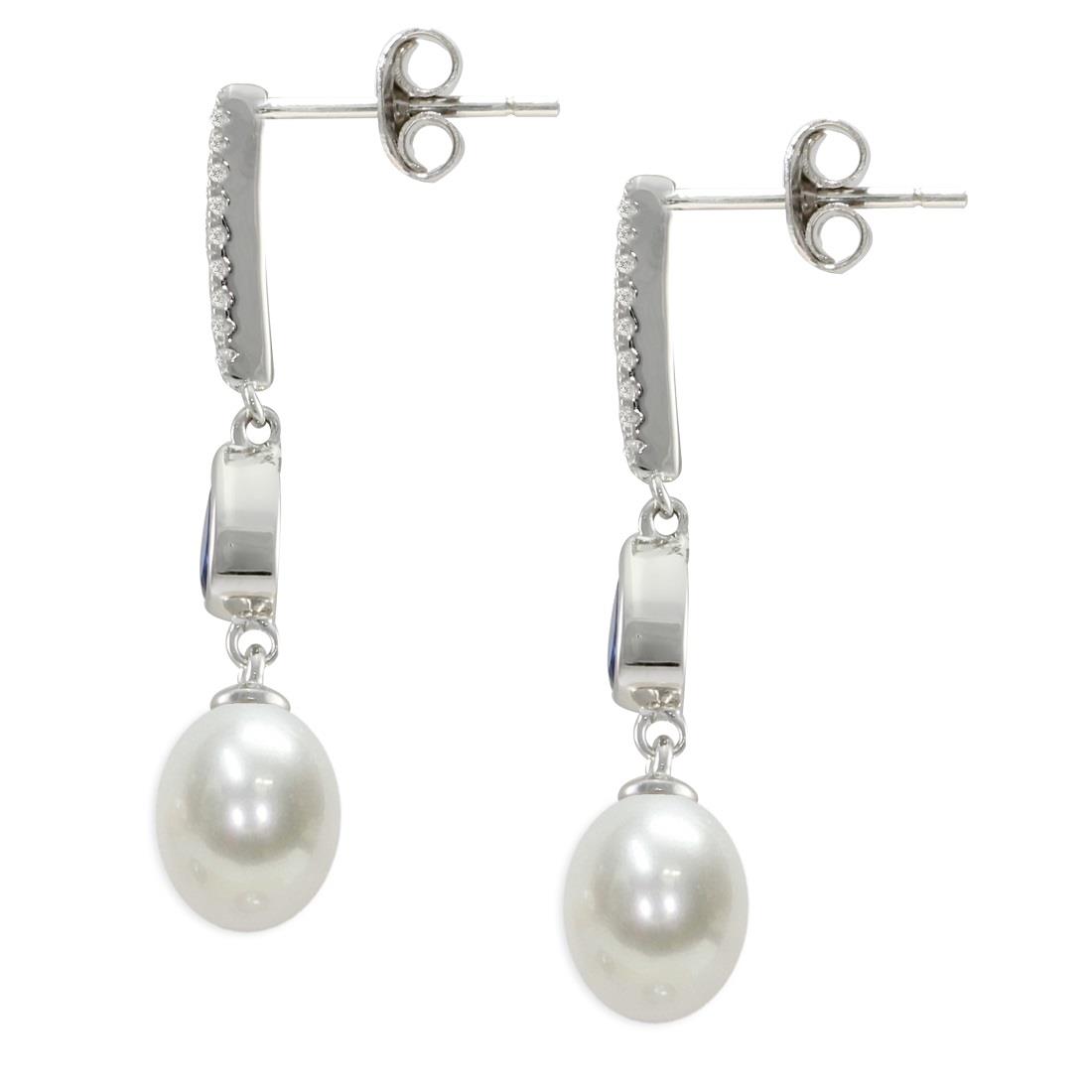 Orecchini pendenti Mayumi in argento con perle piena perlagione drop di diametro 7,5/8 mm e zirconi bianchi e blu.