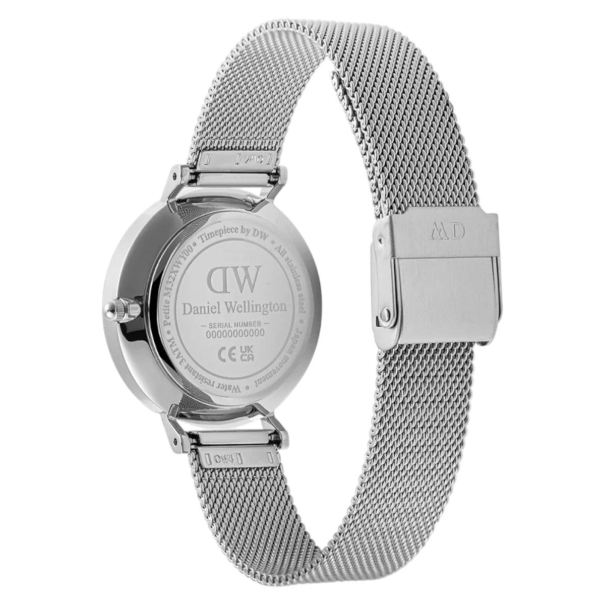Orologio Daniel Wellington da donna della collezione Petite Lune, con cassa color argento da 32 mm che avvolge un quadrante bianco dal design essenziale e luminoso. Il cinturino in maglia mesh argento, con larghezza di 14 mm, dona al modello un’eleganza moderna e raffinata. L’orologio è equipaggiato con movimento al quarzo giapponese.
