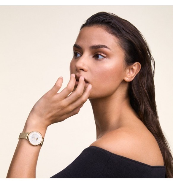Orologio Daniel Wellington da donna della collezione Petite Lune, con cassa color oro da 32 mm che incornicia un quadrante bianco dall’estetica pulita e luminosa. Il cinturino in maglia mesh oro, con larghezza di 14 mm, aggiunge un tocco elegante e contemporaneo. Il modello è dotato di movimento al quarzo giapponese.