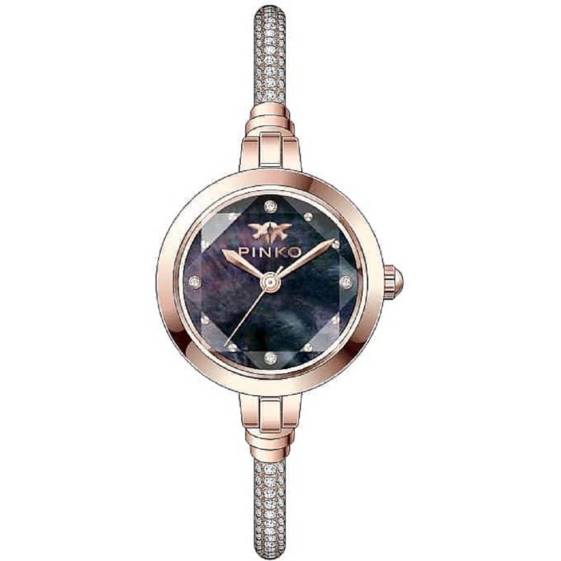 Orologio Pinko cassa 19 mm con quadrante color antracite e cinturino in acciaio color rose gold con cristalli Swarovski bianchi. Resistente all'acqua fino a 3 atm. Movimento al quarzo.