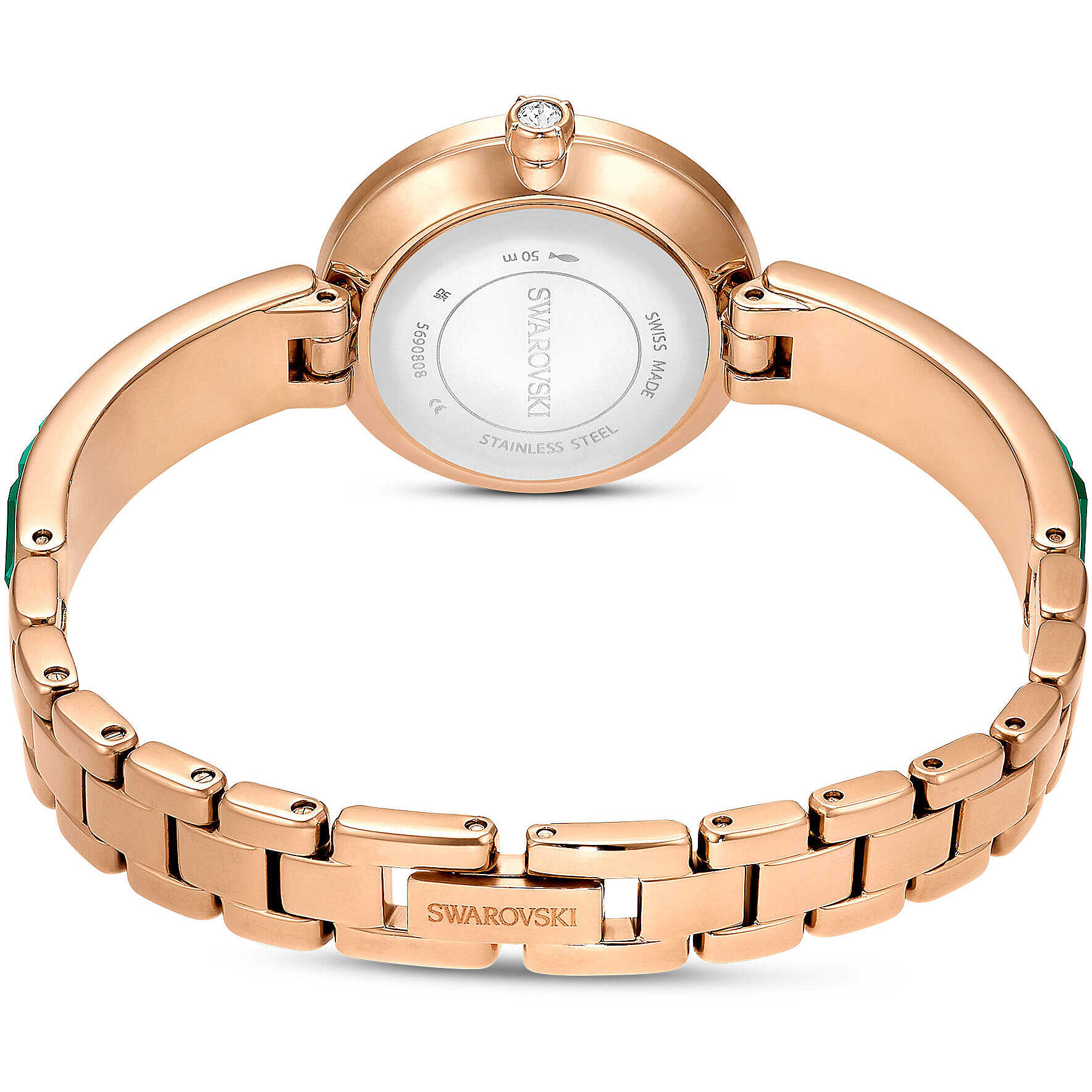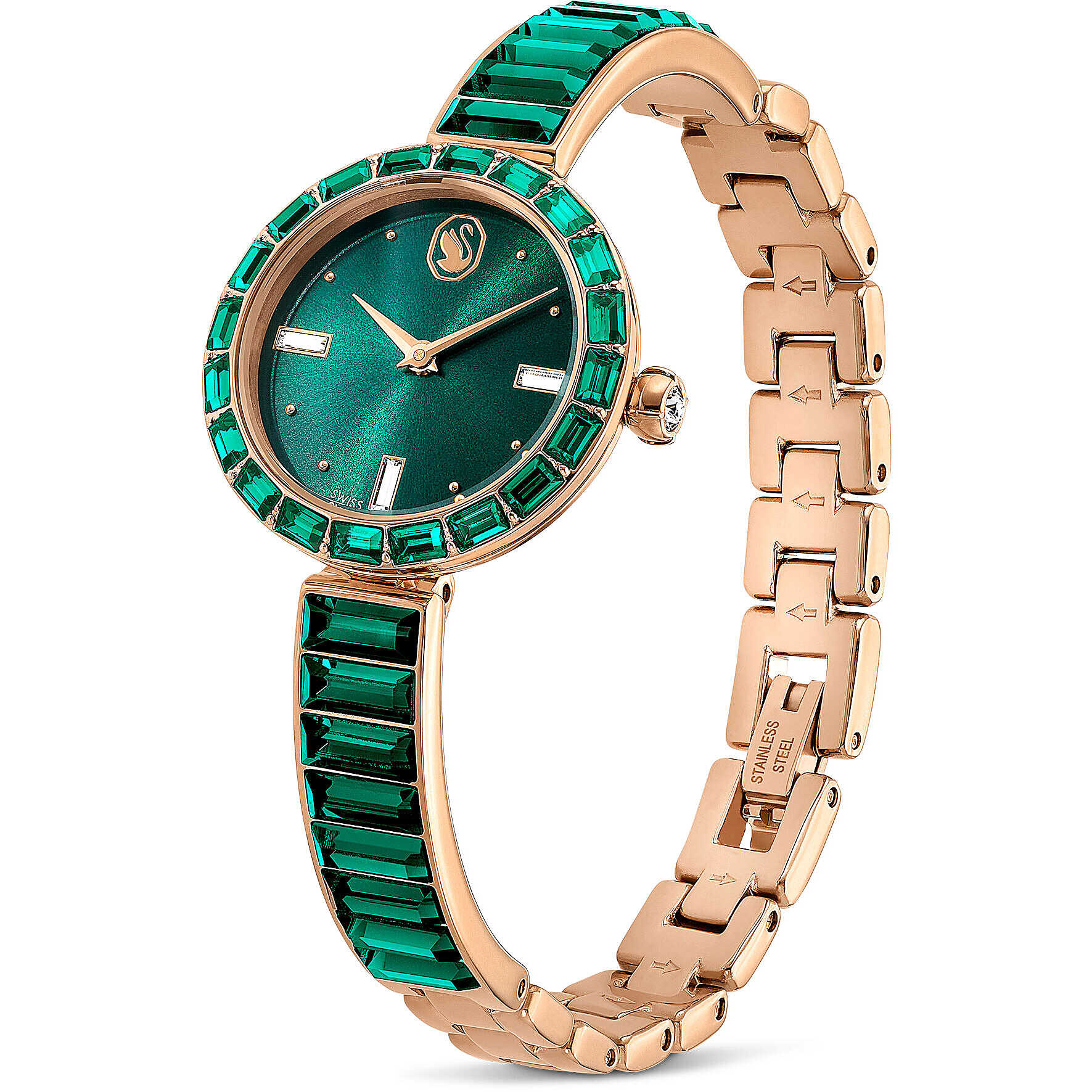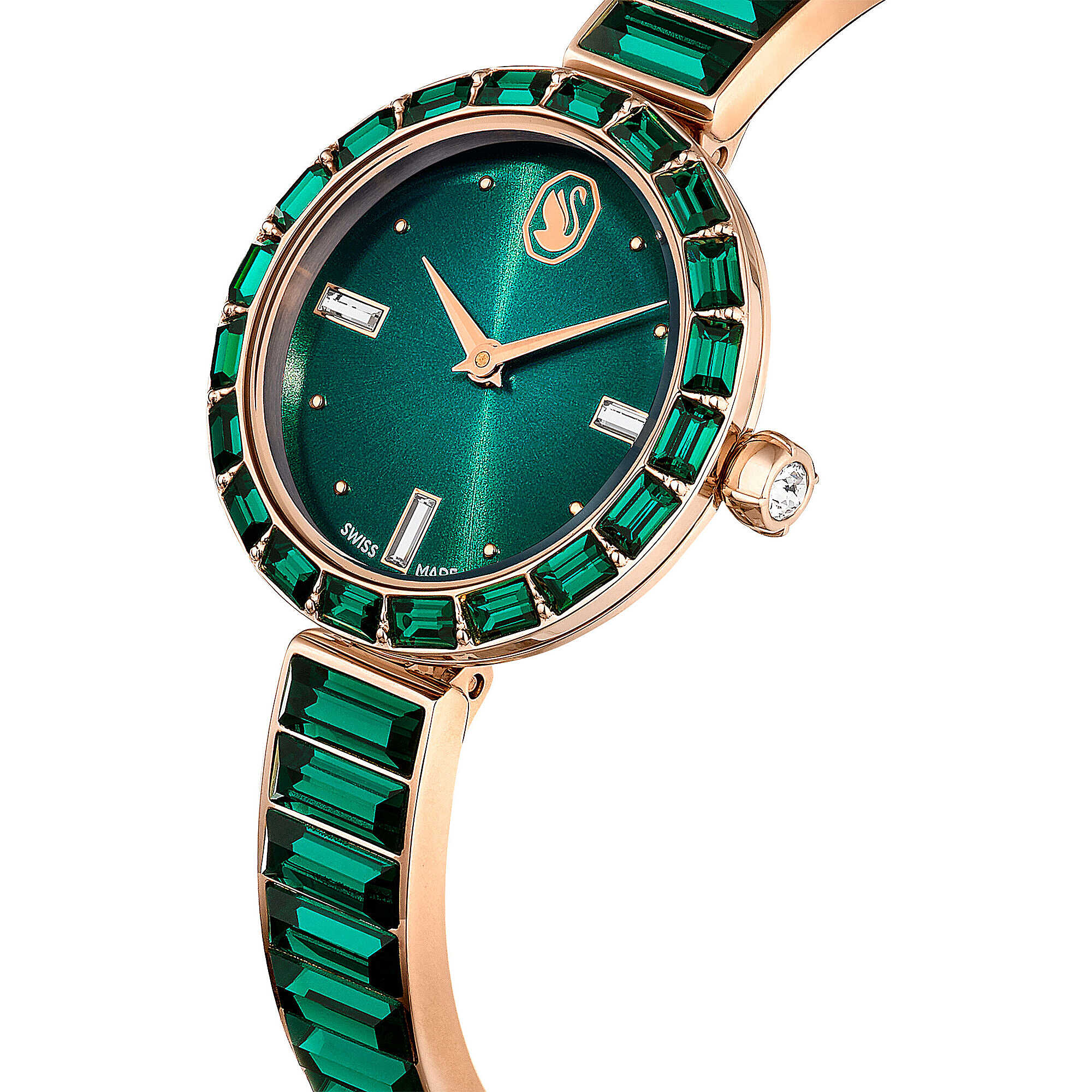 Orologio da donna di Swarovski della collezione Matrix Bangle. L’eleganza è amplificata dai cristalli in questo splendido segnatempo ispirato all’alta gioielleria. Il design in acciaio inossidabile da 25 mm ha una finitura in tonalità oro champagne ed è circondato da una lunetta con 20 cristalli verdi taglio Baguette, mentre un unico cristallo è montato nella corona. Inoltre, cristalli taglio Baguette esaltano i tre indici sul quadrante verde, che presenta anche un logo cigno a ore 12. Attorno al polso, il bracciale in stile bangle è impreziosito da 16 cristalli verdi taglio Baguette ed è interamente regolabile per una comoda vestibilità. L’orologio Swiss Made è resistente all’acqua fino a 50 metri ed è l’accessorio ideale per una storia di stile affascinante. Dimensioni della cassa: 25 mm x 25 mm Lunghezza del cinturino dell'orologio: 16.5 cm. La referenza è 5690808