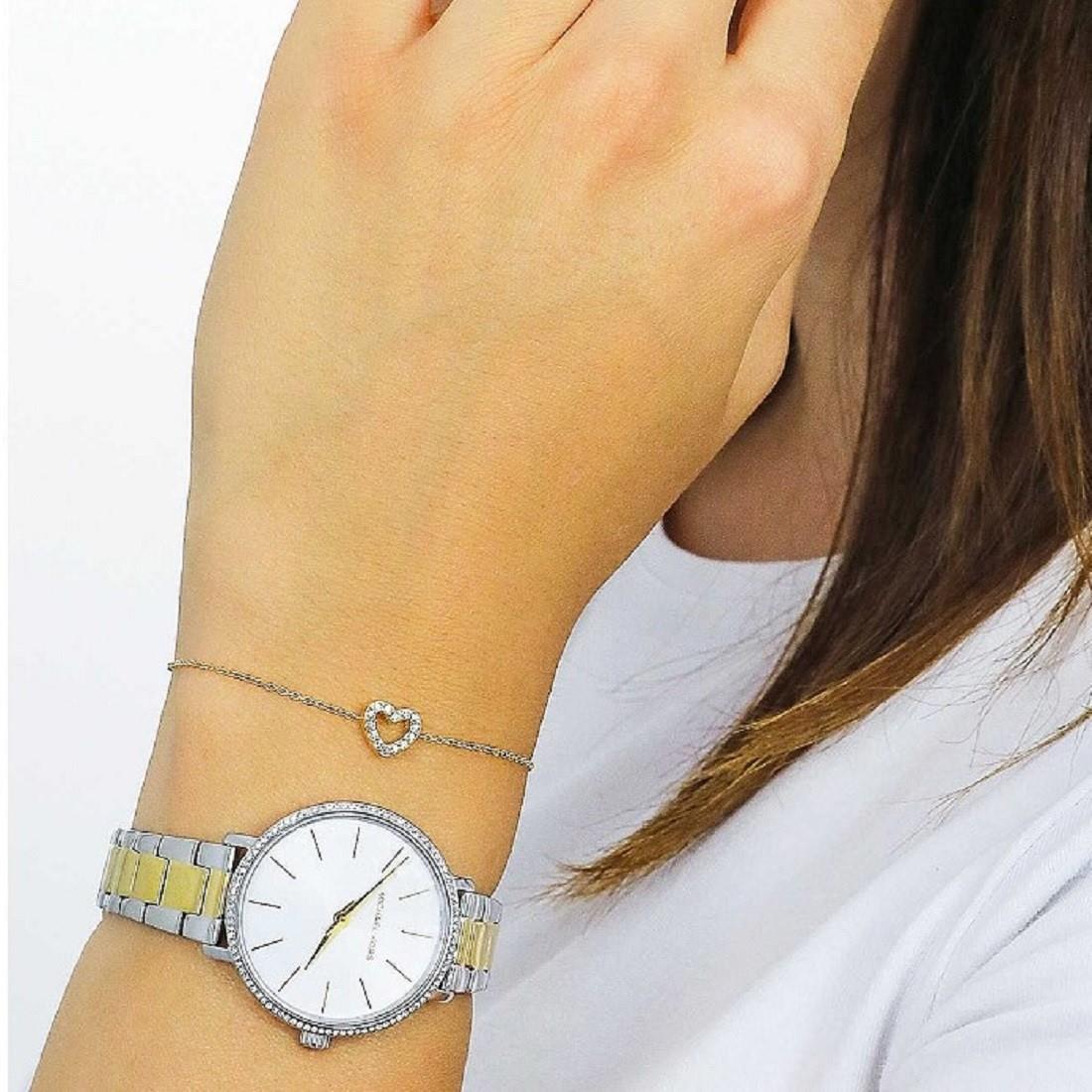 Orologio Michael Kors con cassa da 32 mm in acciaio silver, quadrante bianco e cinturino in acciaio argentato e dorato. Movimento al quarzo, resistente all'acqua 5atm.
