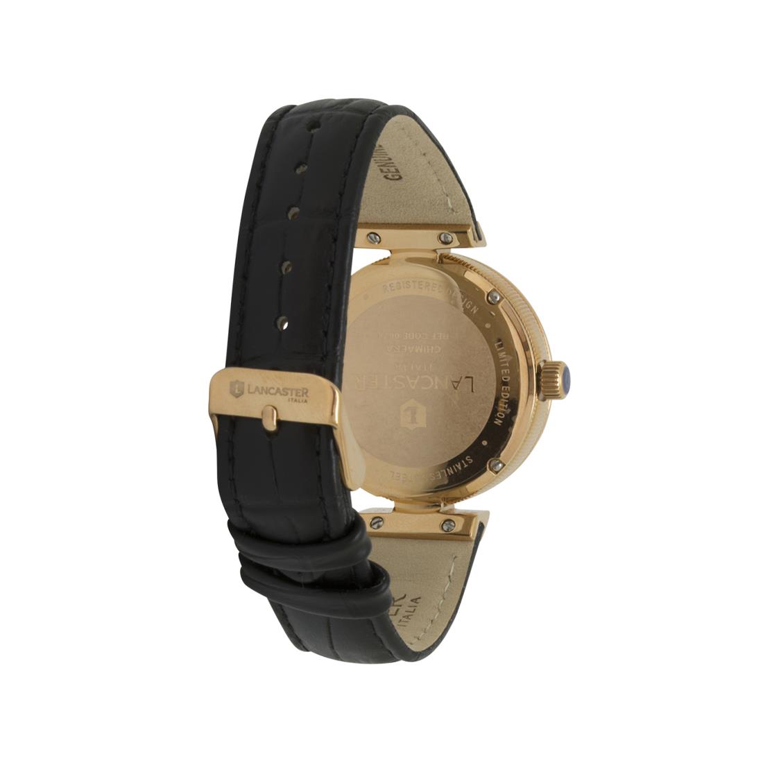 Orologio da donna di Lancaster, dalla collezione Chimaera, con cassa rotonda da 36 mm in acciaio pvd color oro; caratterizzato da un design classico e raffinato prende il nome dal pianeta minore in orbita attorno al sole. Vetro minerale, quadrante con numeri romani e datario; il movimento è al quarzo, il cinturino in pelle stampata con fibbia e logo. Impermeabile sino a 50 metri.