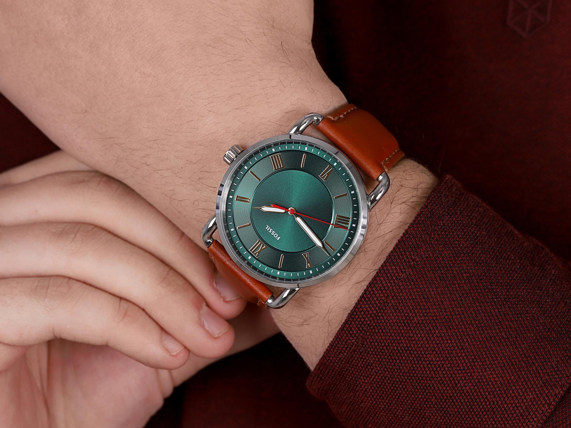 Orologio Fossil collezione COpeland con cassa in acciaio 42mm, quadrante verde, cinturino in pelle marrone, movimento quarzo solo tempo, resistente all'acqua fino a 5atm