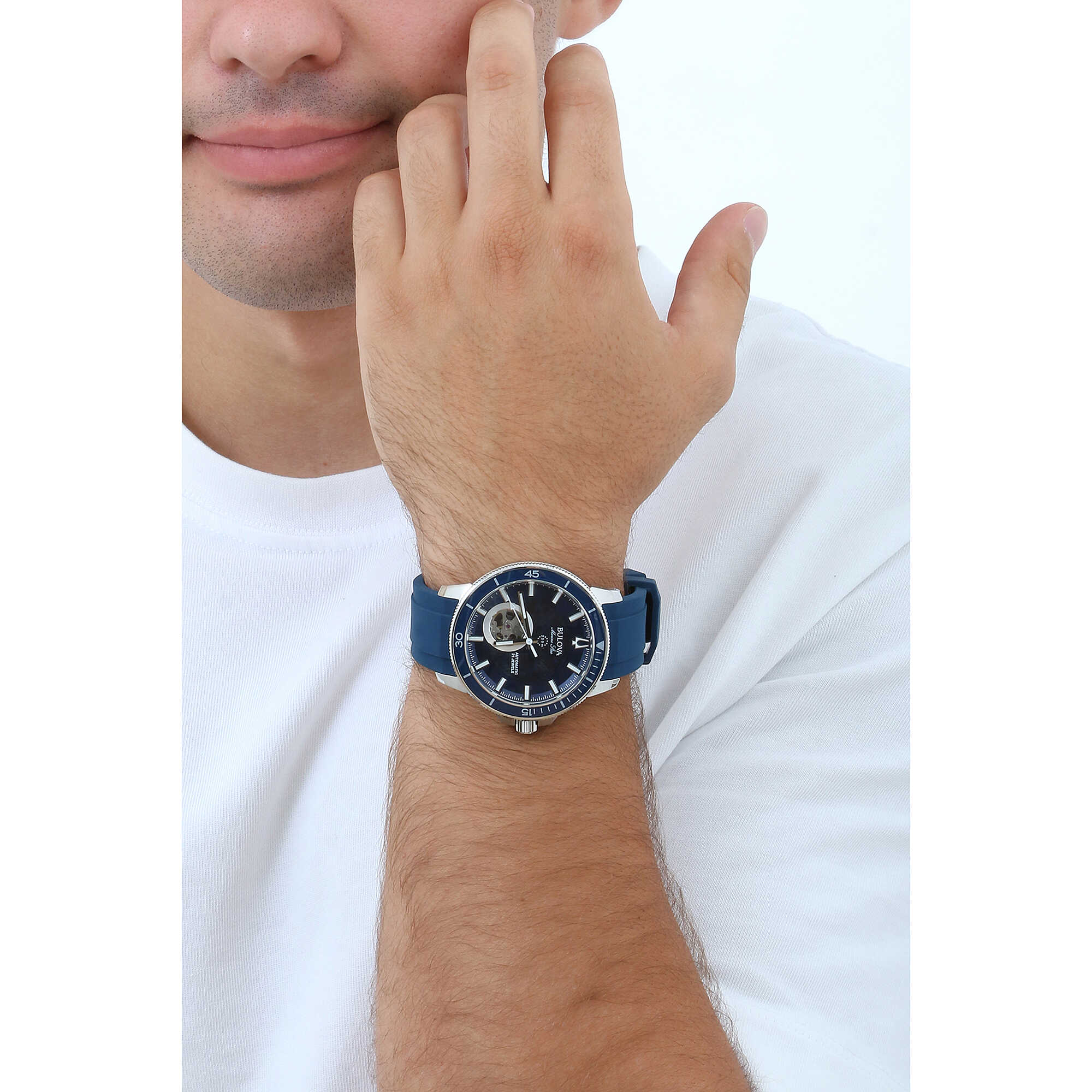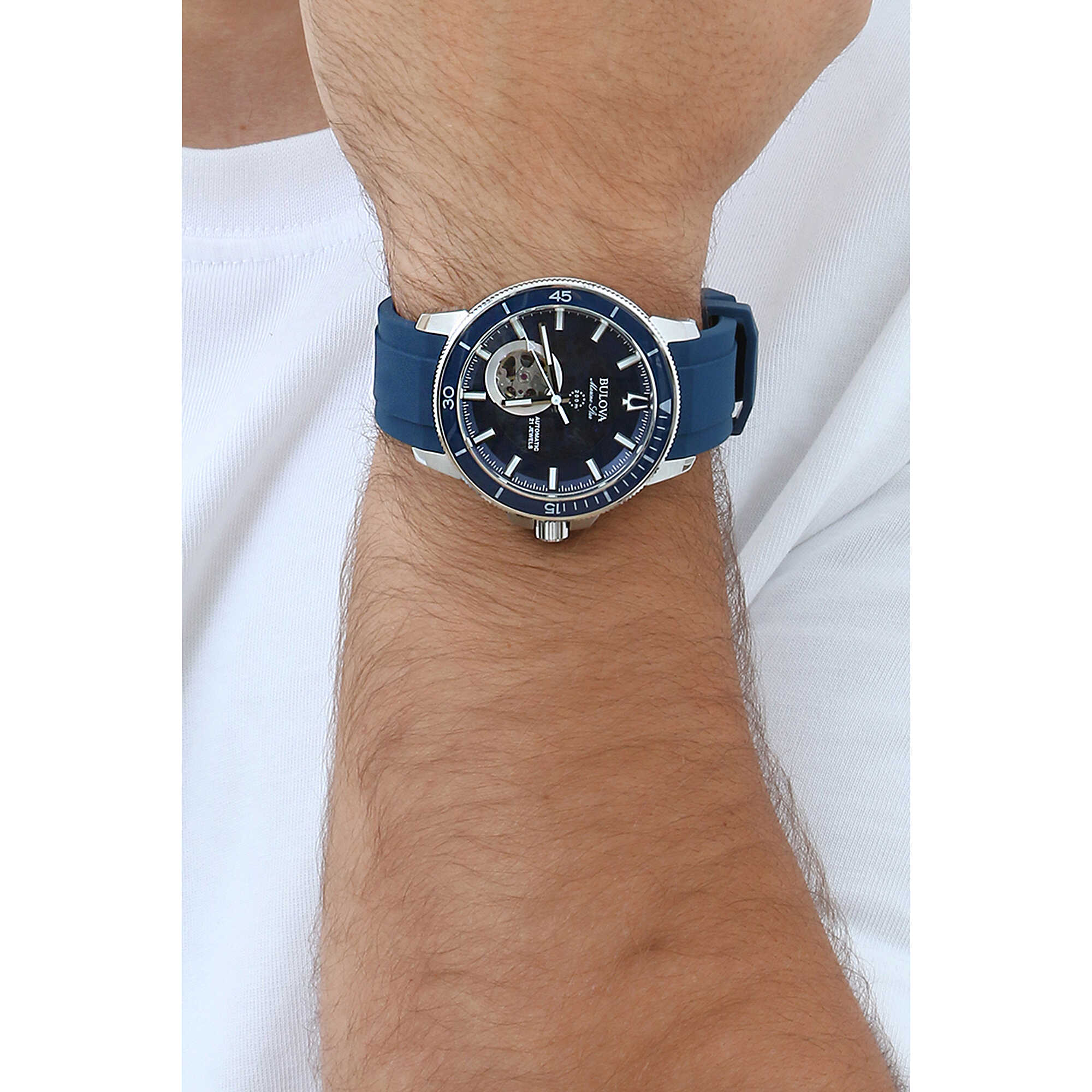 Orologio Solo Tempo da uomo di Bulova della collezione Marine Star. Orologio con cassa realizzata in acciaio di dimensioni 45 mm. Materiale cinturino: caucciù di colore blu; chiusura ardiglione. Indici a tacche e movimento automatico. Resistenza all'acqua: 20 ATM. La referenza è 96A303.