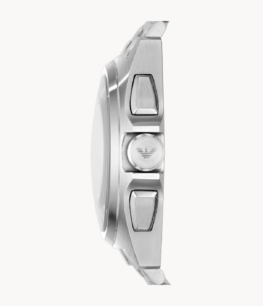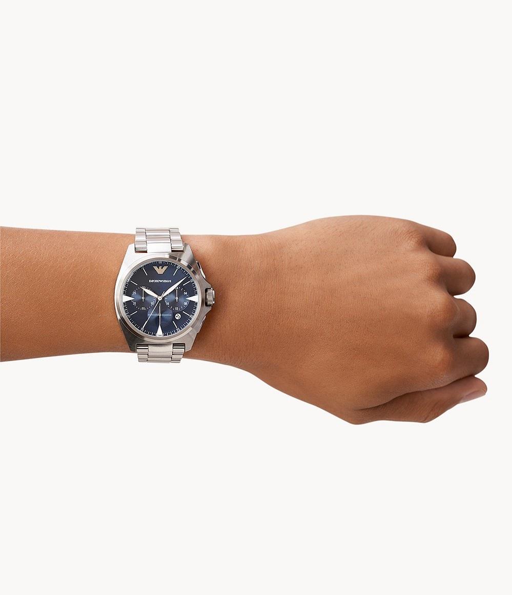 Orologio Emporio Armani con cassa in acciaio inossidabile 41 mm, cinturino in acciaio, quadrante blu con vetro minerale. Movimento al quarzo con cronografo, resistenza all'acqua di 5atm.