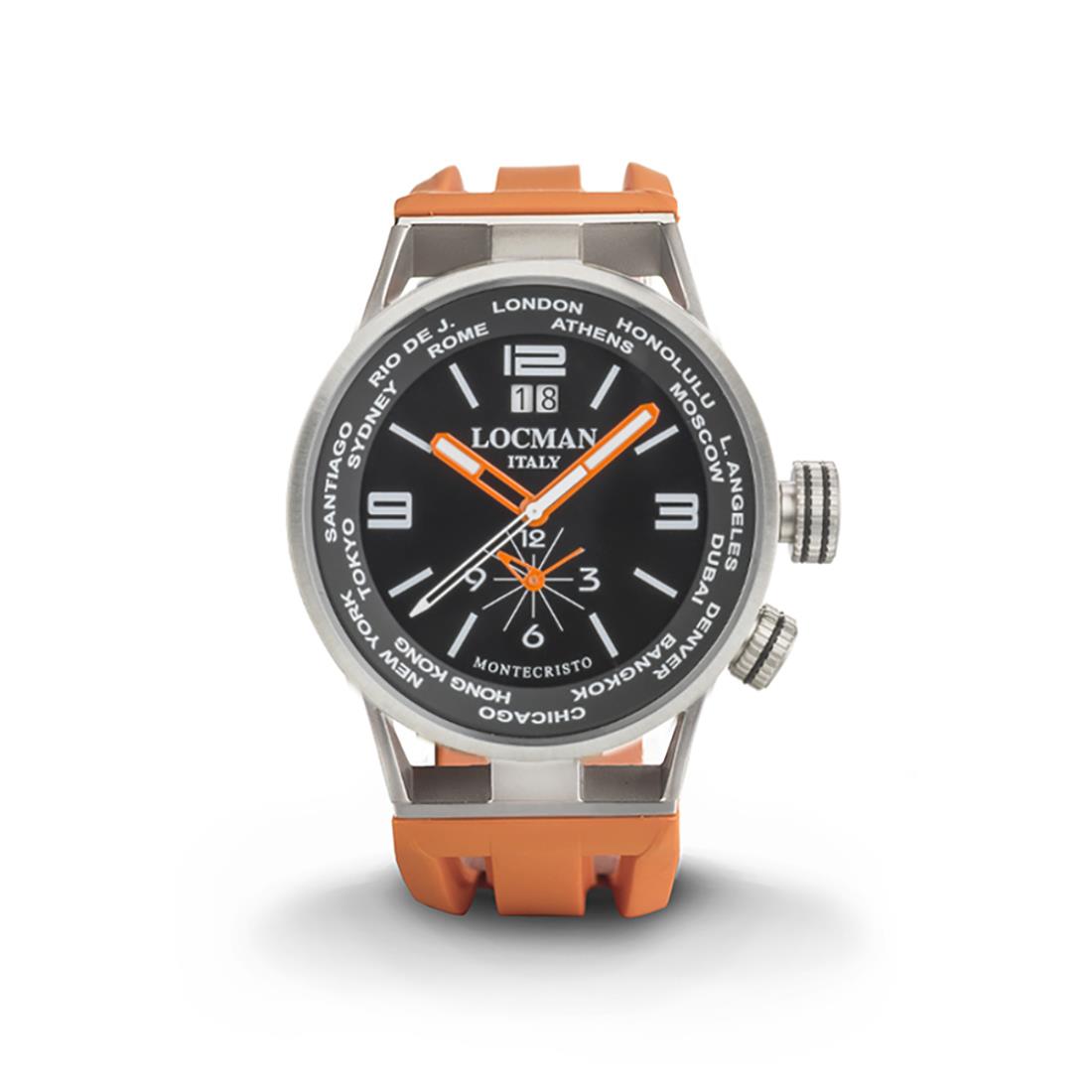 Orologio Locman Montecristo con cassa in acciaio e titanio 44mm, quadrante nero, movimento dual time al quarzo, cinturino in silicone arancione, vetro minerale antigraffio, impermeabilità 10 atm