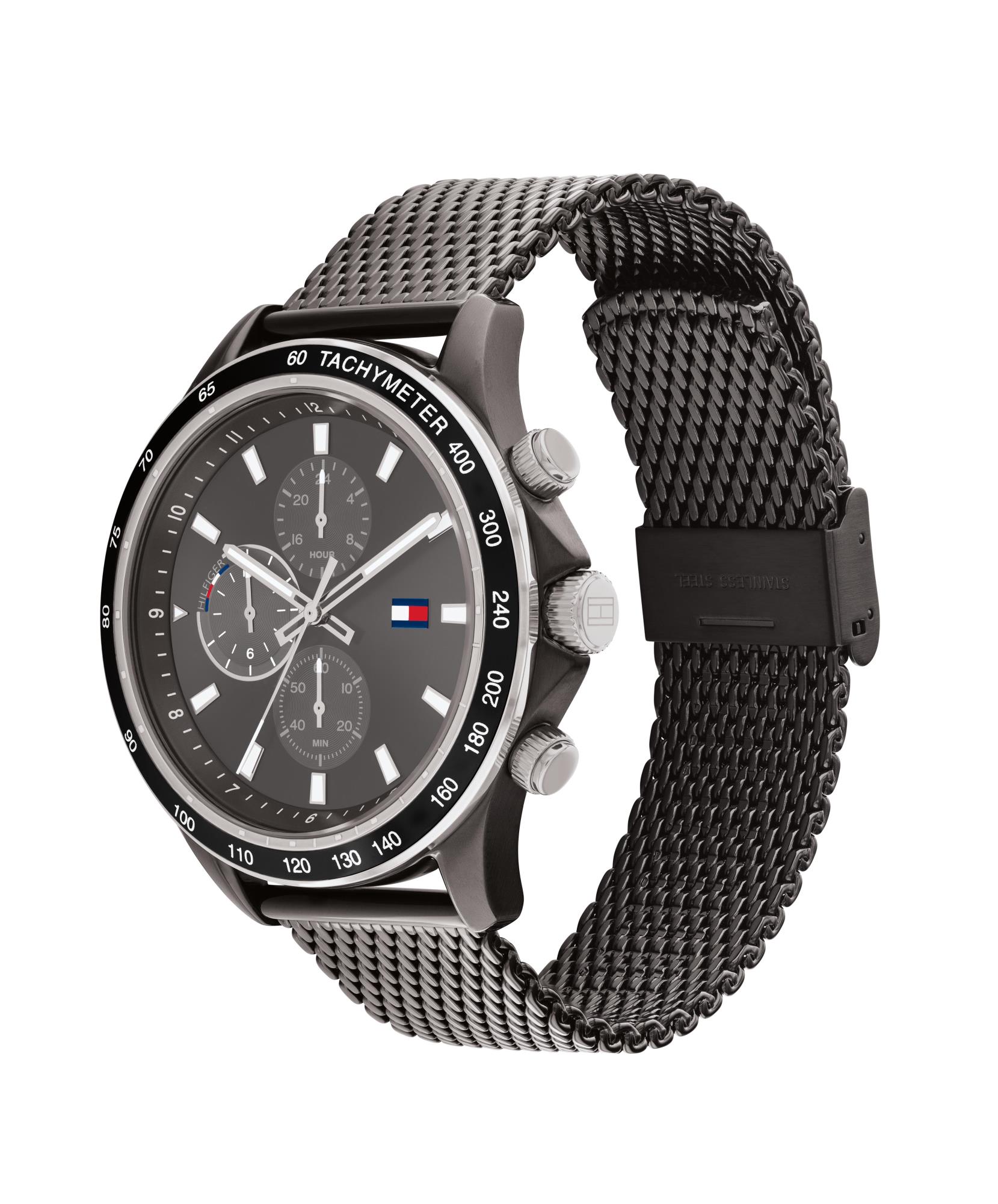 Orologio uomo Tommy Hilfiger in accaio, cassa 44mm in acciaio grigio, quadrante grigio, cinturino in maglia grigio. Orologio multifunzionale, movimento al quarzo, resistente all'acqua fino a 5ATM