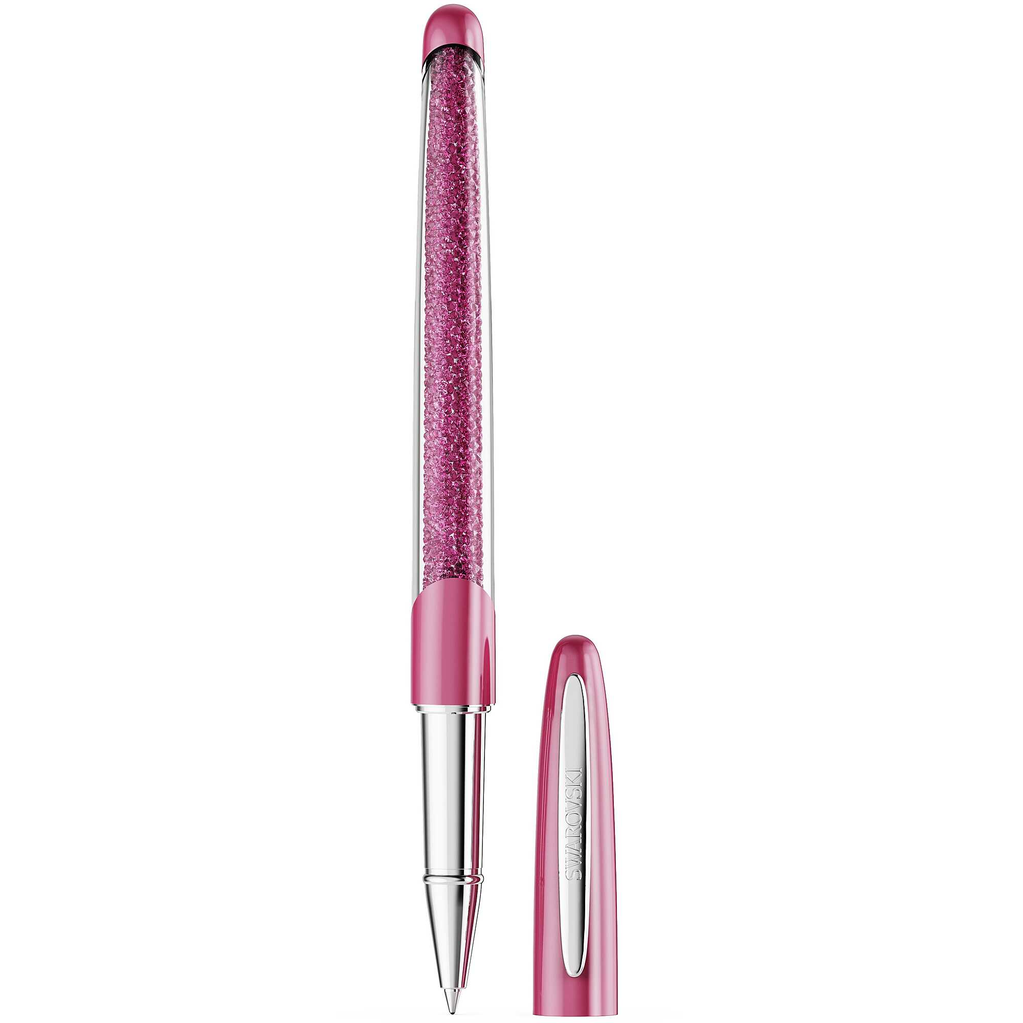 Penna roller Swarovski collezione Crystalline Nova con finitura cromata e cristalli rosa. Realizzata con circa 400 cristalli incastonati secondo la tecnica Crystalline, presenta un fusto e un cappuccio lucidi con clip placcata in tonalità argento. Compatibile con refill d’inchiostro nero e blu. Misura: 14.5 x 1.1 cm.