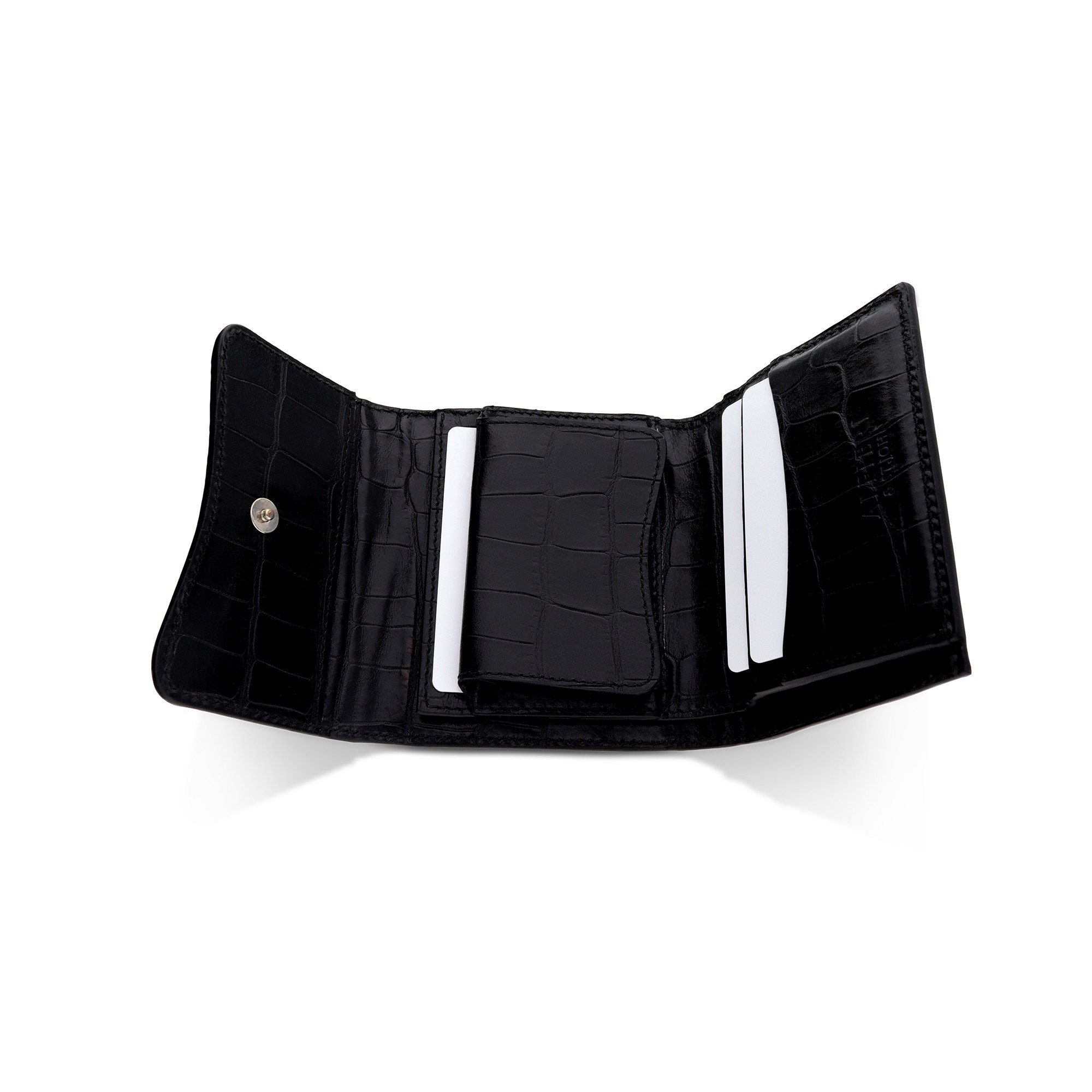Portafoglio da donna Alfieri & St. John in pelle nera effetto coccodrillo, un accessorio dal carattere sofisticato che unisce eleganza decisa e praticità quotidiana. La texture cocco conferisce profondità e personalità al design, valorizzata dal dettaglio metallico frontale con logo e dalle cuciture rifinite con cura. L’interno, progettato per un’organizzazione impeccabile, include tre scomparti per carte di credito, una tasca porta monete con chiusura a bottone e un comodo vano porta banconote. Un modello compatto, strutturato e distintivo, ideale per chi cerca stile e funzionalità in un unico accessorio.