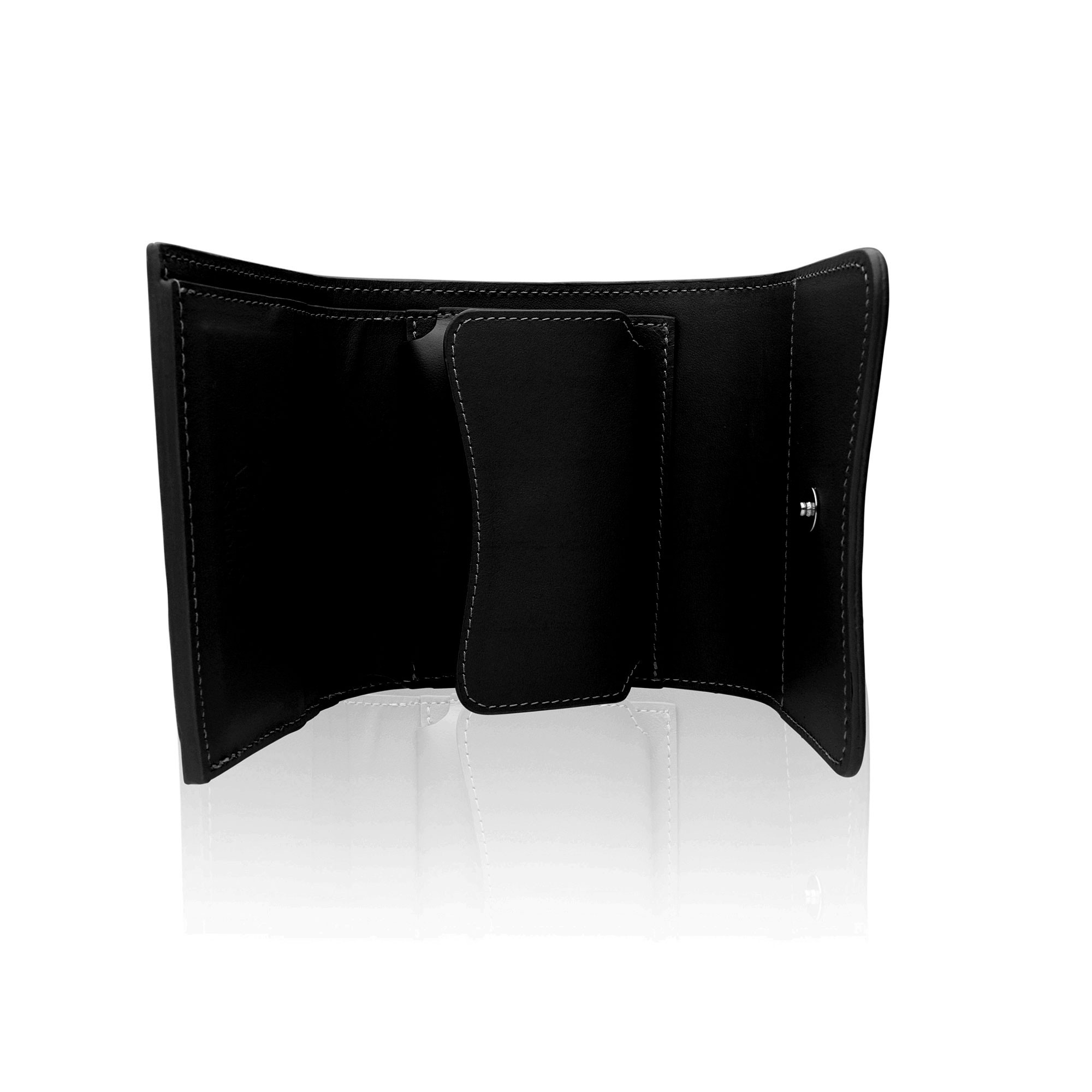 Portafoglio da donna Alfieri & St. John in pelle nera, caratterizzato da un design essenziale e raffinato, realizzato in morbida pelle liscia e impreziosito dal dettaglio metallico frontale con logo. Le cuciture a contrasto valorizzano la linea pulita della patta, mentre l’interno, organizzato con cura, offre tre scomparti per carte di credito, una tasca porta monete con chiusura a bottone e un pratico vano porta banconote. La struttura compatta e la texture interna effetto coccodrillo aggiungono un tocco sofisticato, rendendolo un accessorio elegante e funzionale da utilizzare ogni giorno.