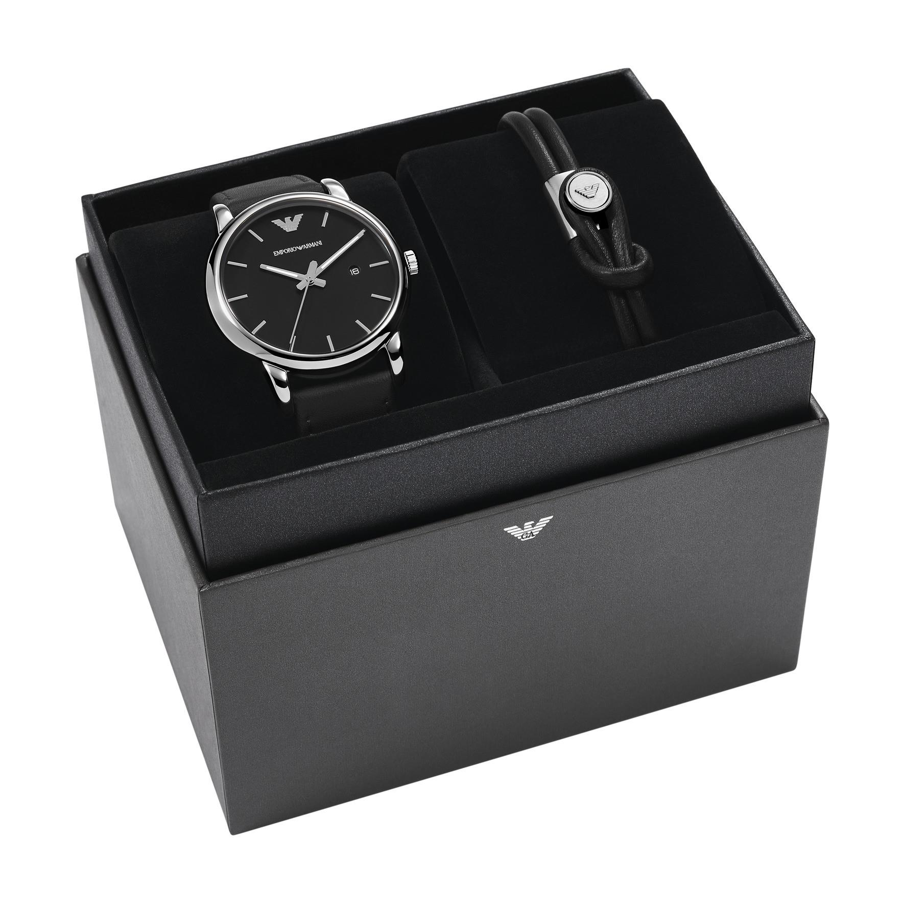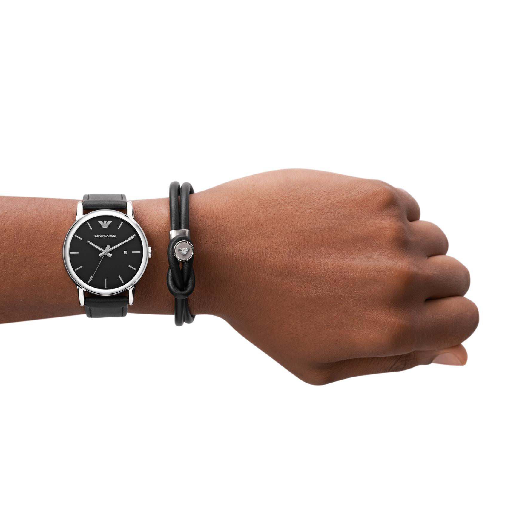 Set regalo orologio e bracciale Emporio Armani, orologio cassa 41mm in acciaio, quadrante nero, cinturino in pelle nera, movimento quarzo, resistente all'acqua fino a 5ATM. Bracciale in pelle nera con chiusura in acciaio.