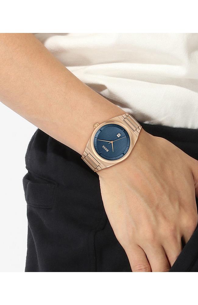 Orologio Hugo Boss Steer con cassa in acciaio 43mm, cinturino in acciaio gold, cassa blu,vetro minerale, movimento quarzo, resistente all'acqua fino a 5ATM.